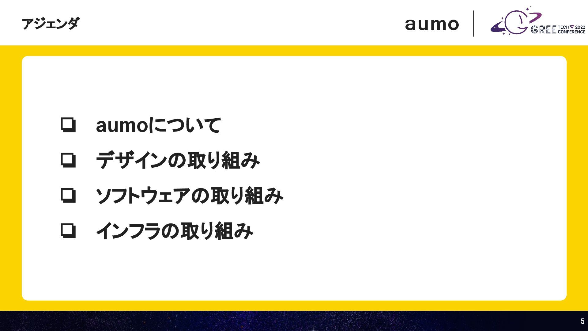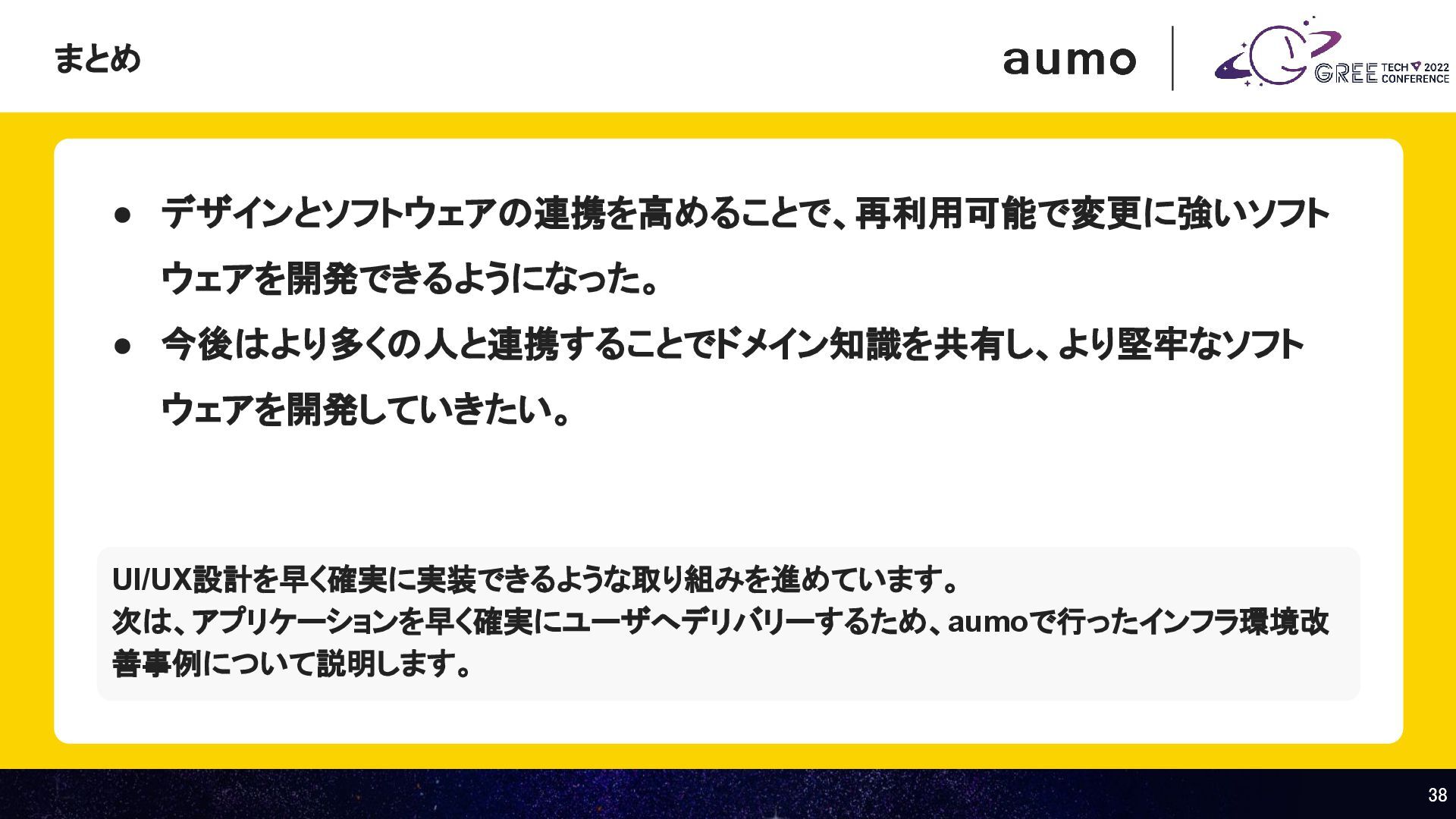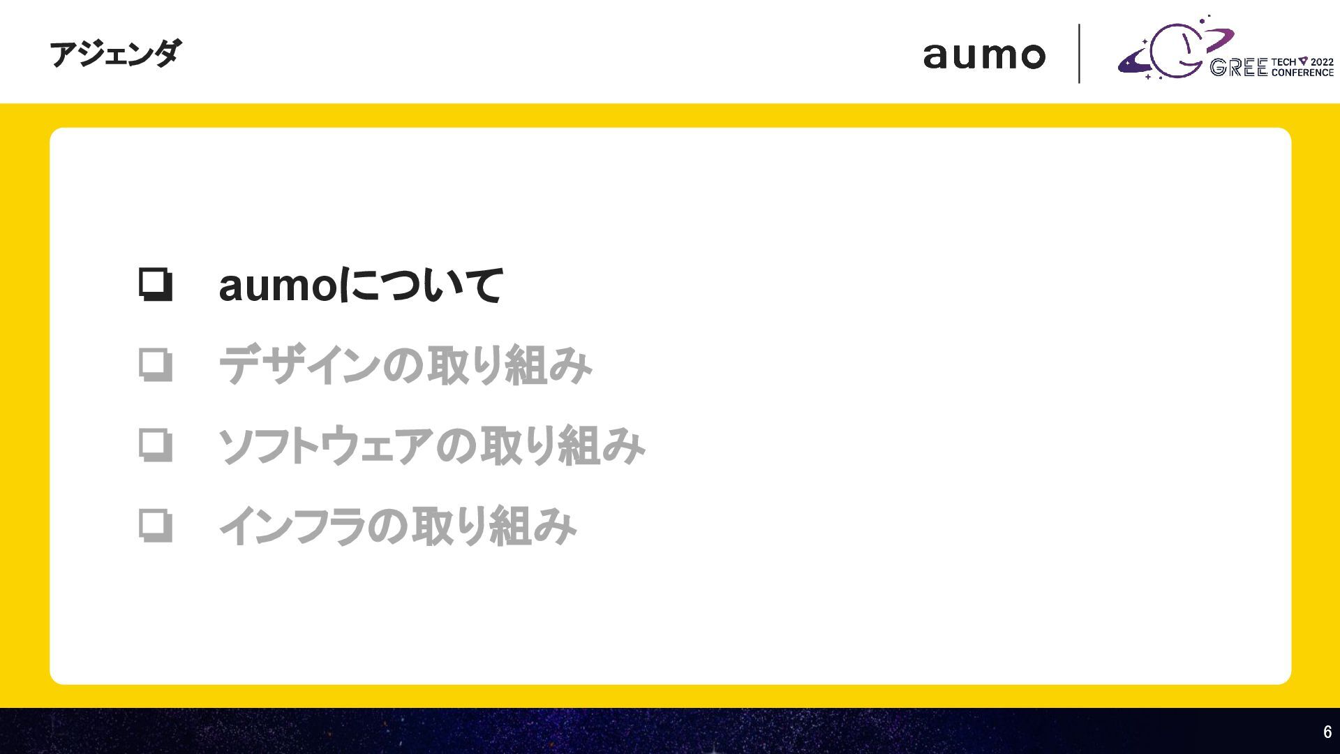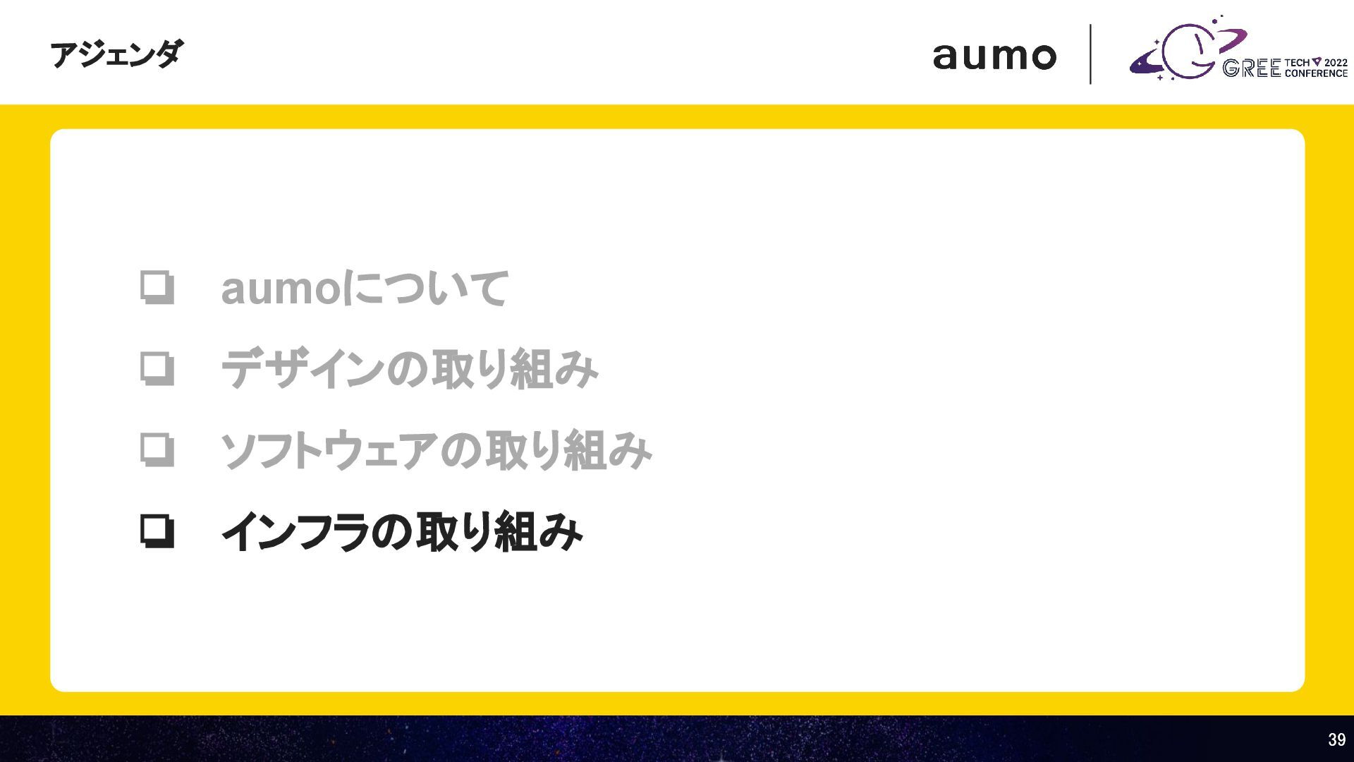 39 39 ❏ aumoについて ❏ デザインの取り組み ❏ ソフトウェアの取り組み ❏ インフラの取り組み