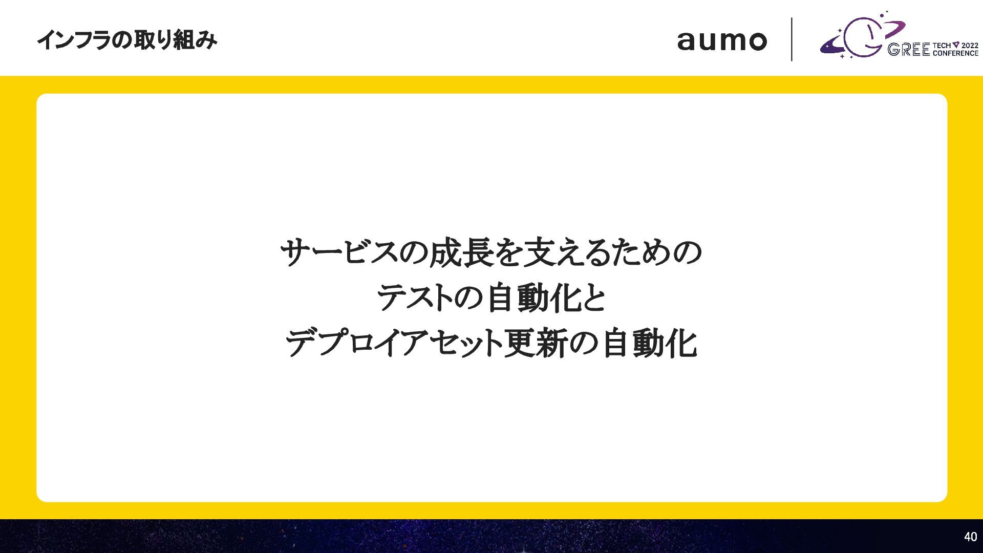 40 40 サービスの成長を支えるための テストの自動化と デプロイアセット更新の自動化 インフラの取り組み