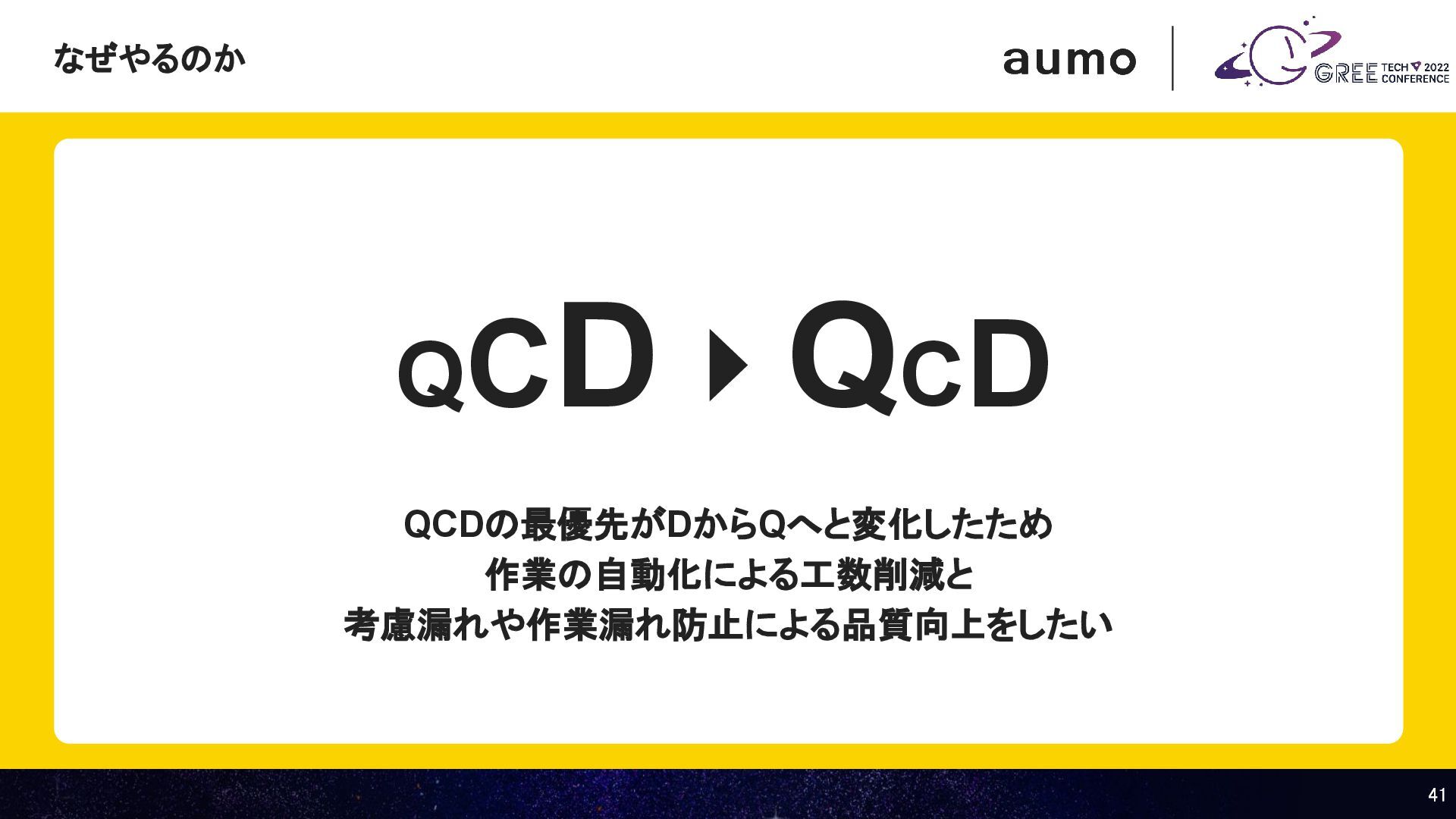 41 41 QCDの最優先がDからQへと変化したため 作業の自動化による工数削減と 考慮漏れや作業漏れ防止による品質向上をしたい なぜやるのか QCD QCD