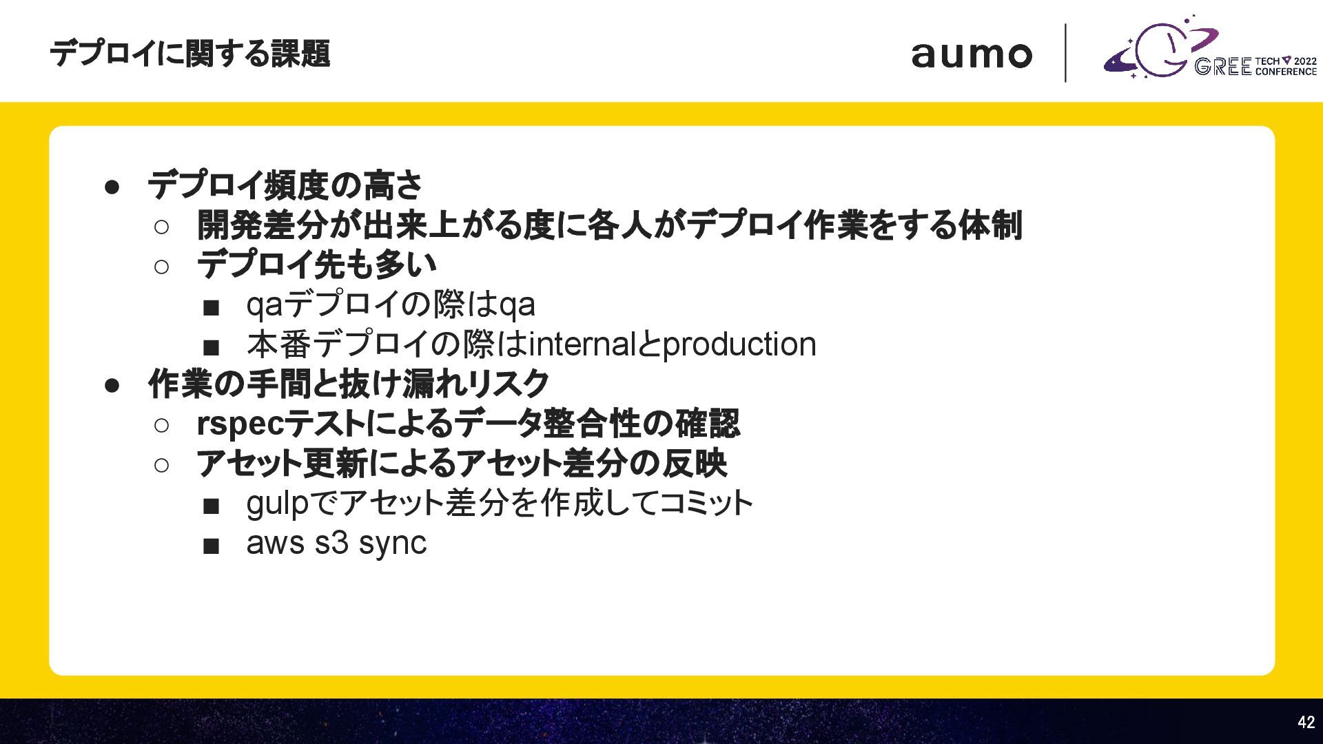 ▪ 本番デプロイの際はinternalとproduction • 作業の手間と抜け漏れリスク ◦ rspecテストによるデータ整合性の確認 ◦ アセット更新によるアセット差分の反映 ▪ gulpでアセット差分を作成してコミット ▪ aws s3 sync デプロイに関する課題