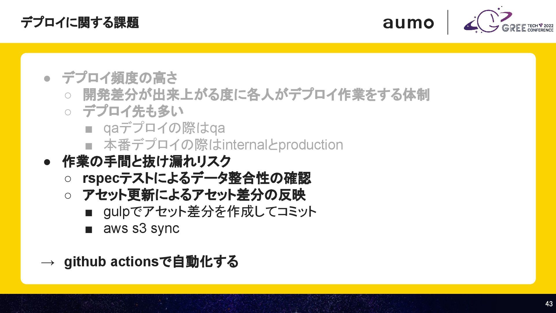▪ 本番デプロイの際はinternalとproduction • 作業の手間と抜け漏れリスク ◦ rspecテストによるデータ整合性の確認 ◦ アセット更新によるアセット差分の反映 ▪ gulpでアセット差分を作成してコミット ▪ aws s3 sync → github actionsで自動化する デプロイに関する課題
