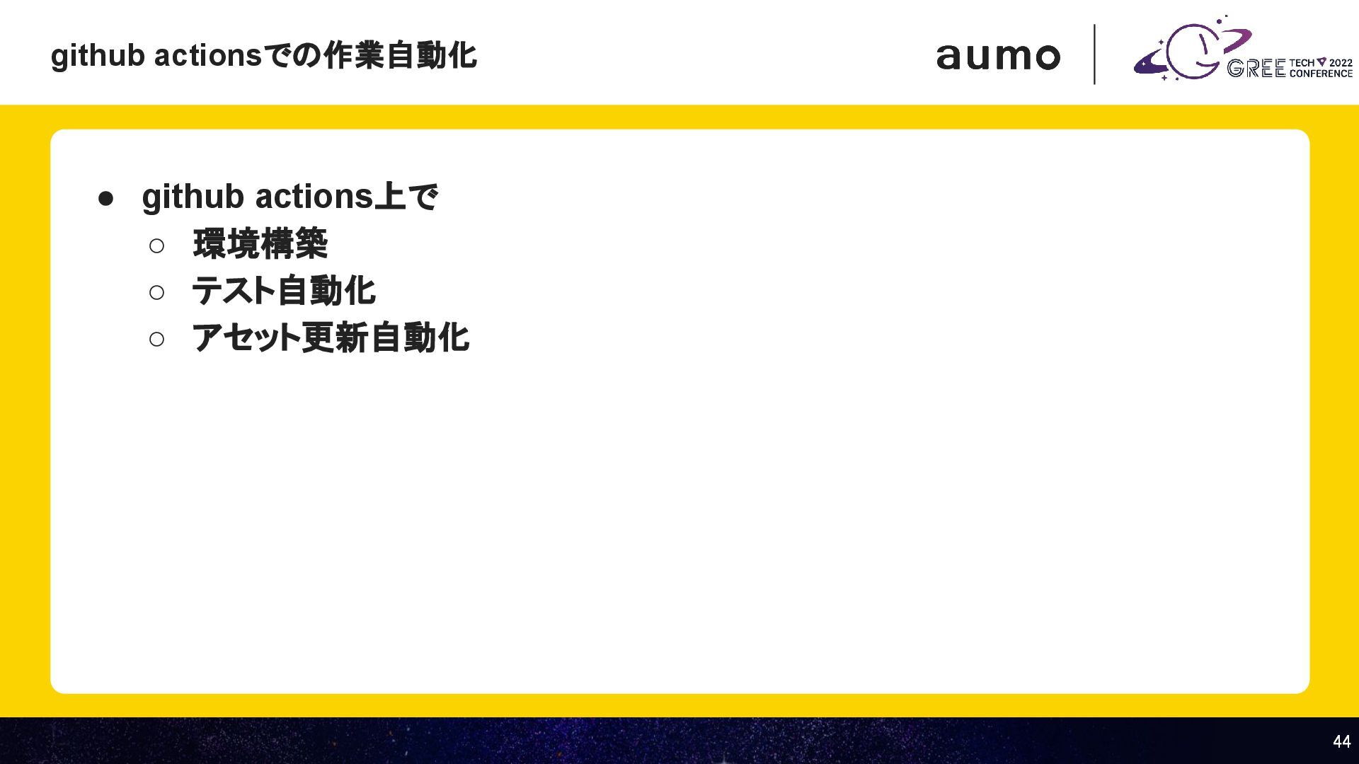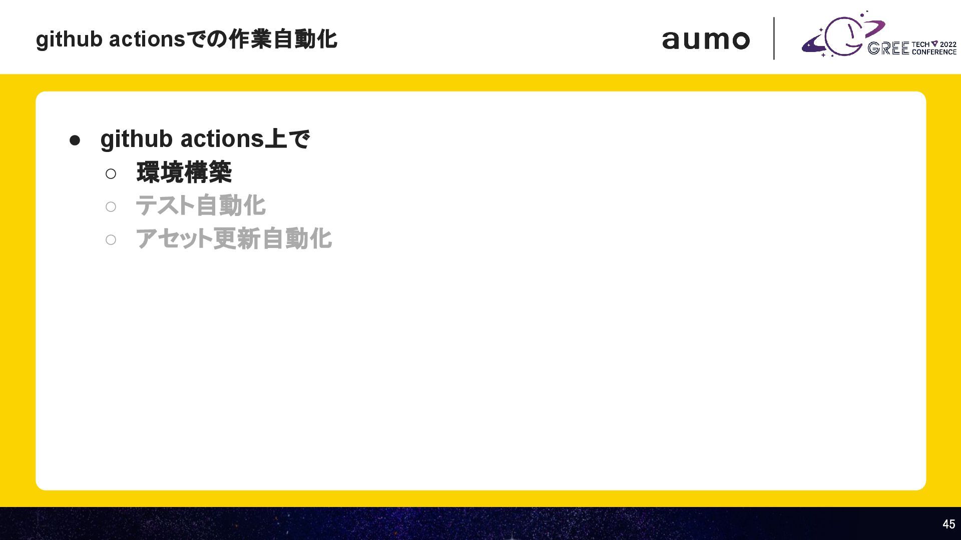44 44 • github actions上で ◦ 環境構築 ◦ テスト自動化 ◦