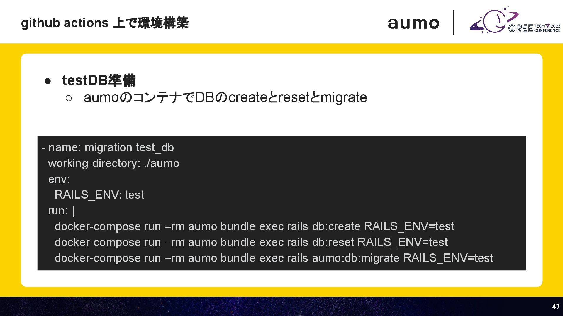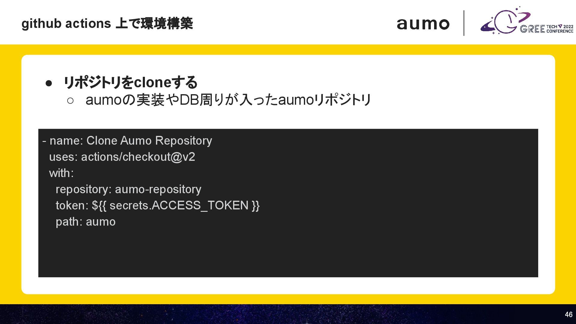 46 46 • リポジトリをcloneする ◦ aumoの実装やDB周りが入ったaumoリポジトリ - name: Clone Aumo