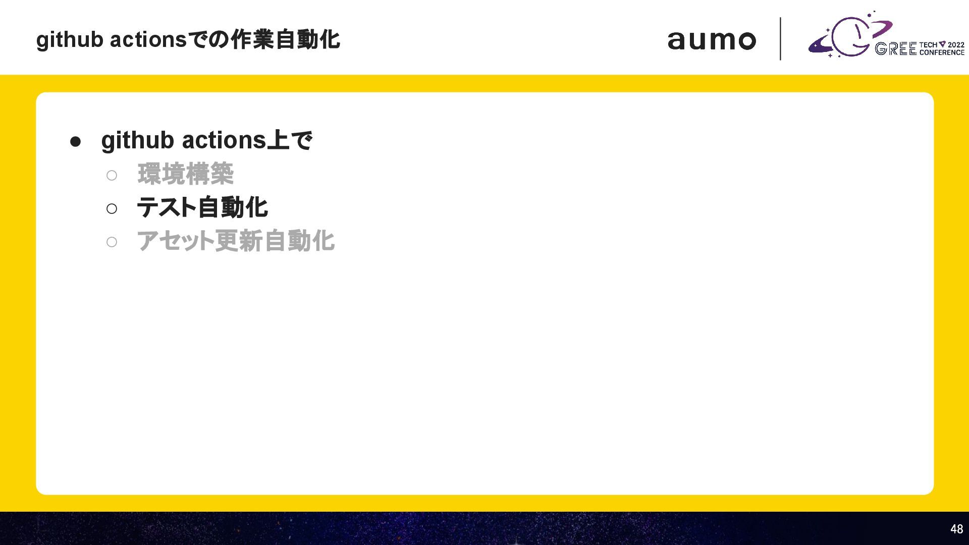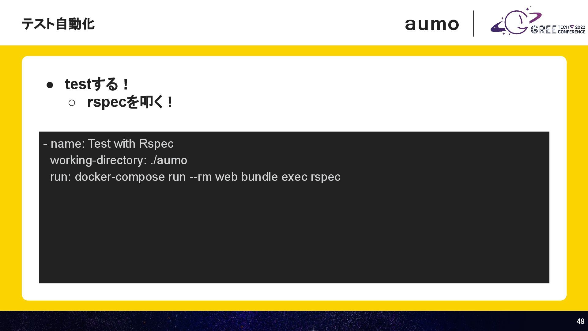 48 48 • github actions上で ◦ 環境構築 ◦ テスト自動化 ◦