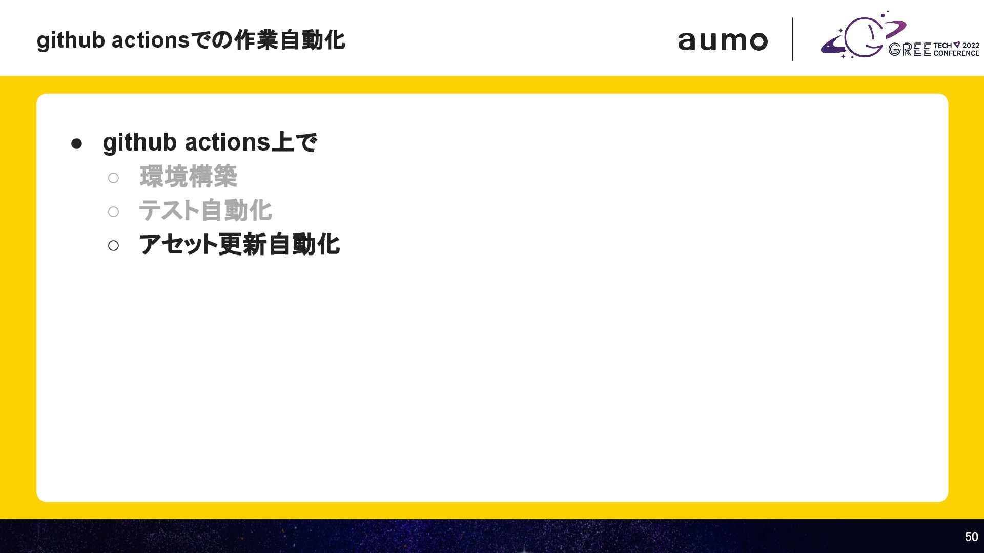 50 50 • github actions上で ◦ 環境構築 ◦ テスト自動化 ◦