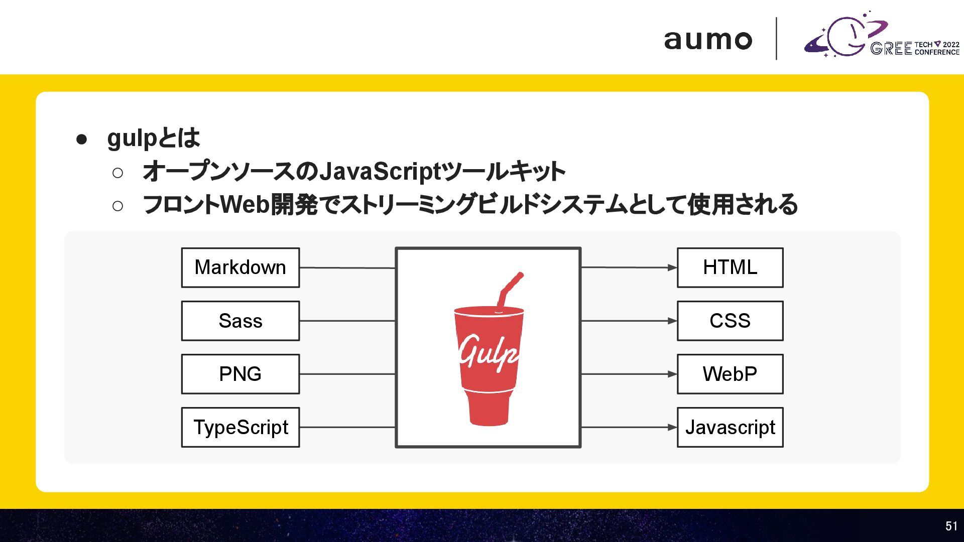 51 51 • gulpとは ◦ オープンソースのJavaScriptツールキット ◦ フロントWeb開発でストリーミングビルドシステムとして使用される TypeScript PNG