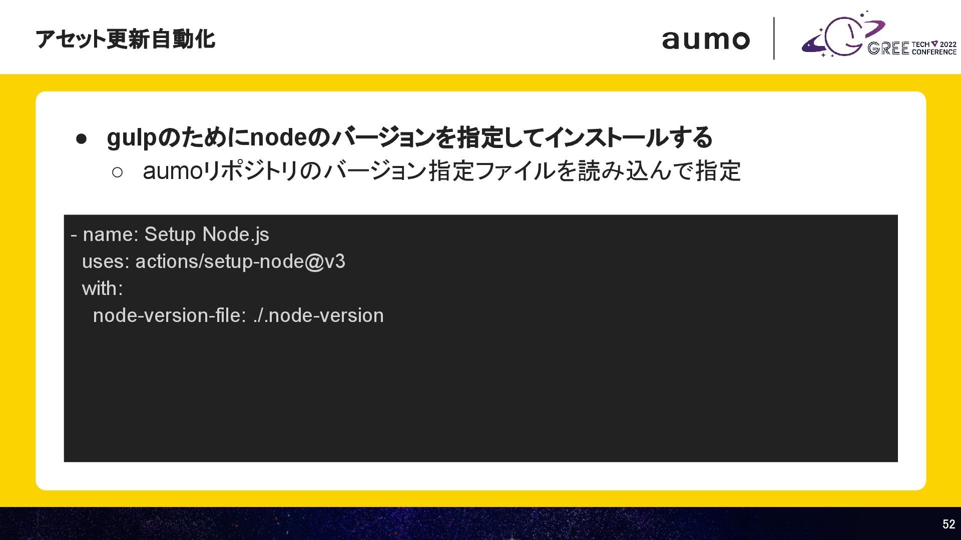52 52 • gulpのためにnodeのバージョンを指定してインストールする ◦ aumoリポジトリのバージョン指定ファイルを読み込んで指定 - name: Setup Node.js