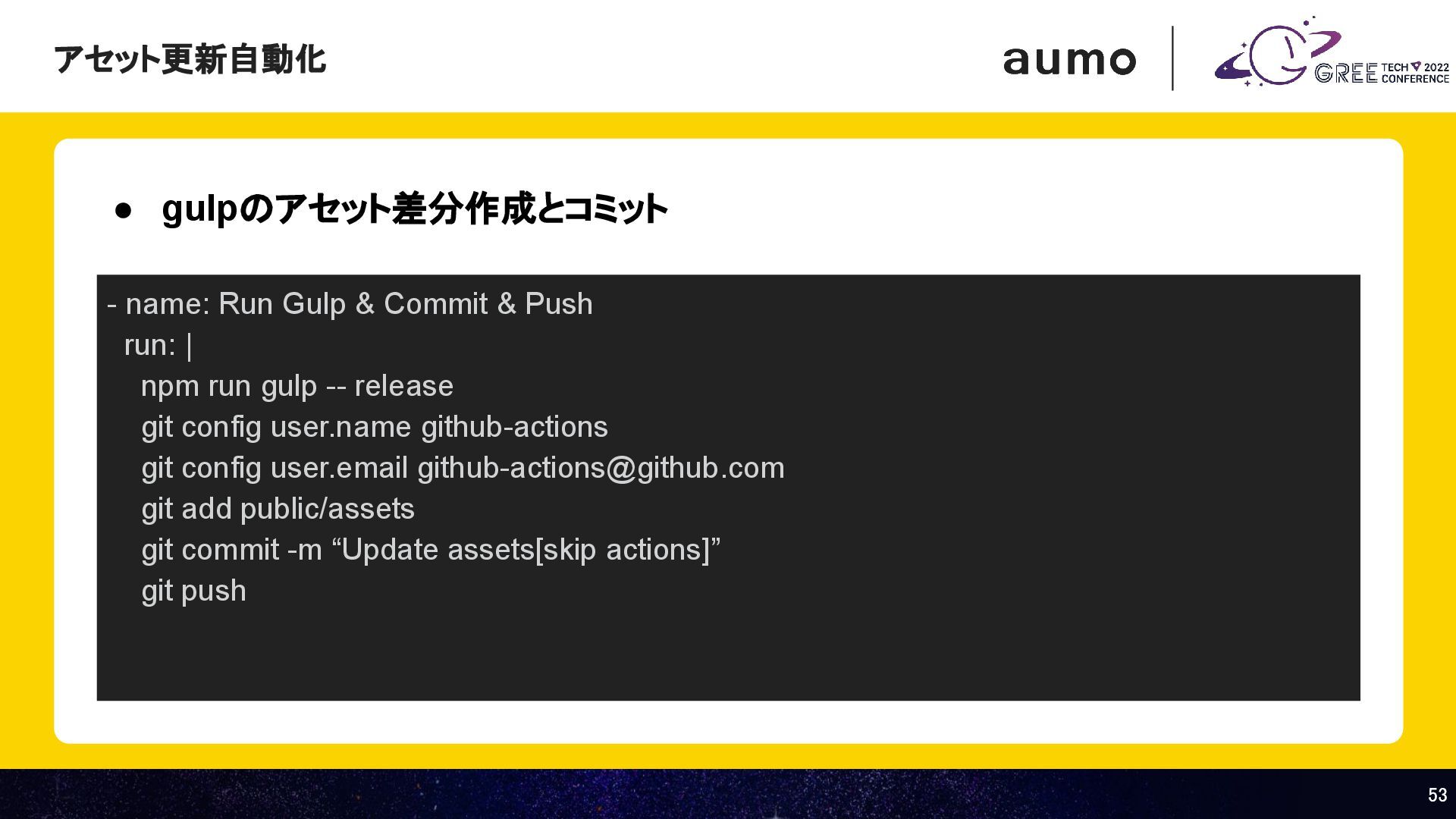 53 53 • gulpのアセット差分作成とコミット - name: Run Gulp & Commit