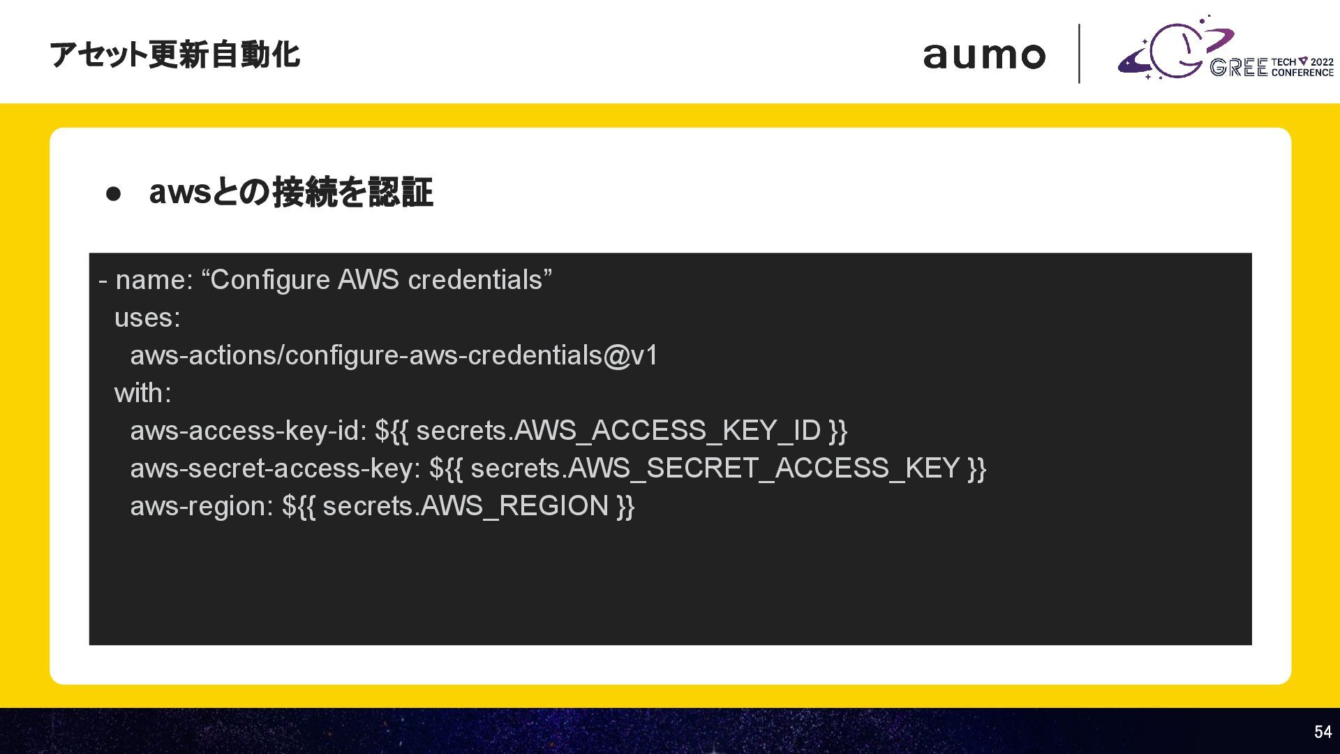 54 54 • awsとの接続を認証 - name: “Configure AWS credentials” uses: