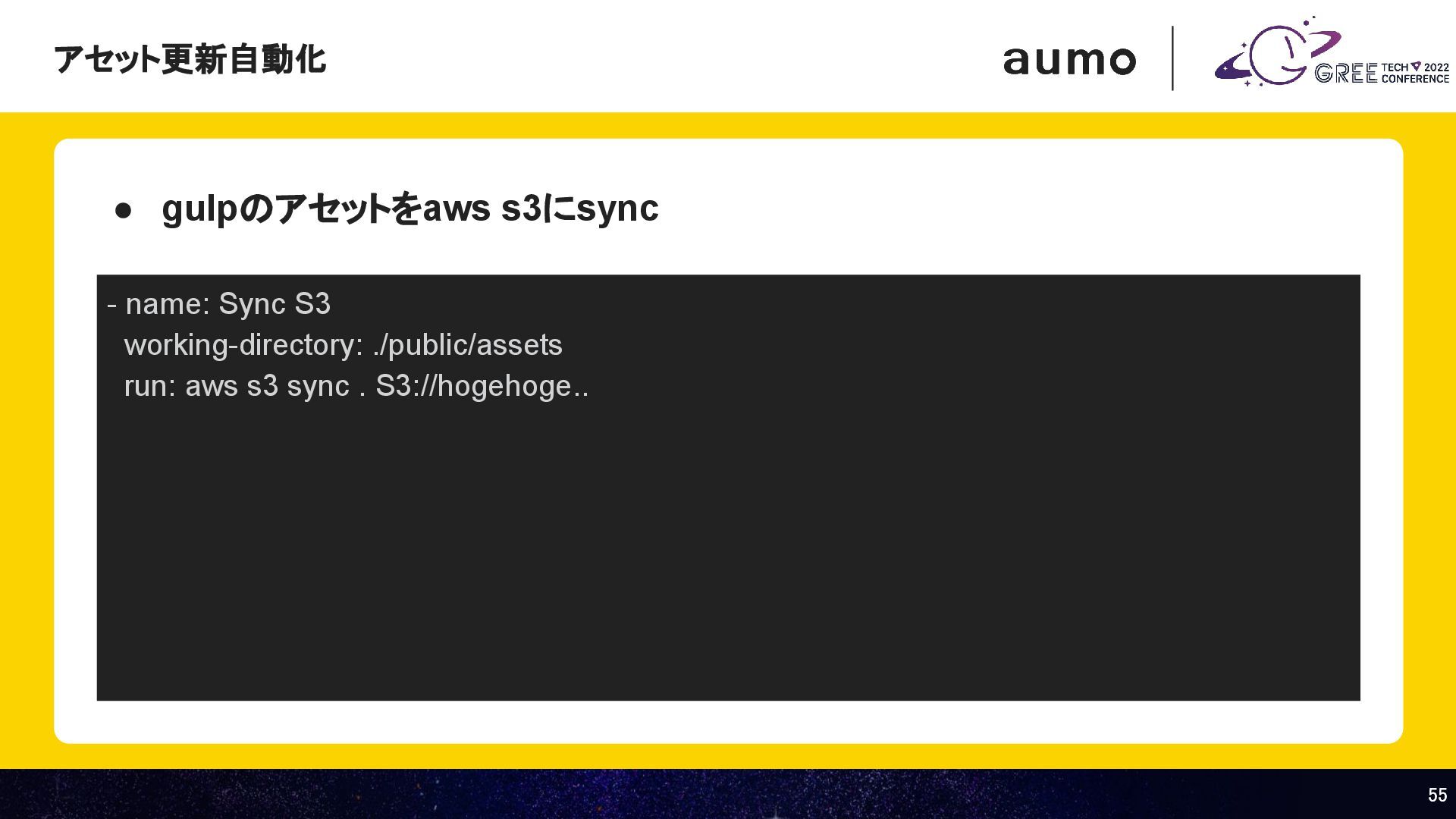 55 55 • gulpのアセットをaws s3にsync アセット更新自動化 - name: Sync S3