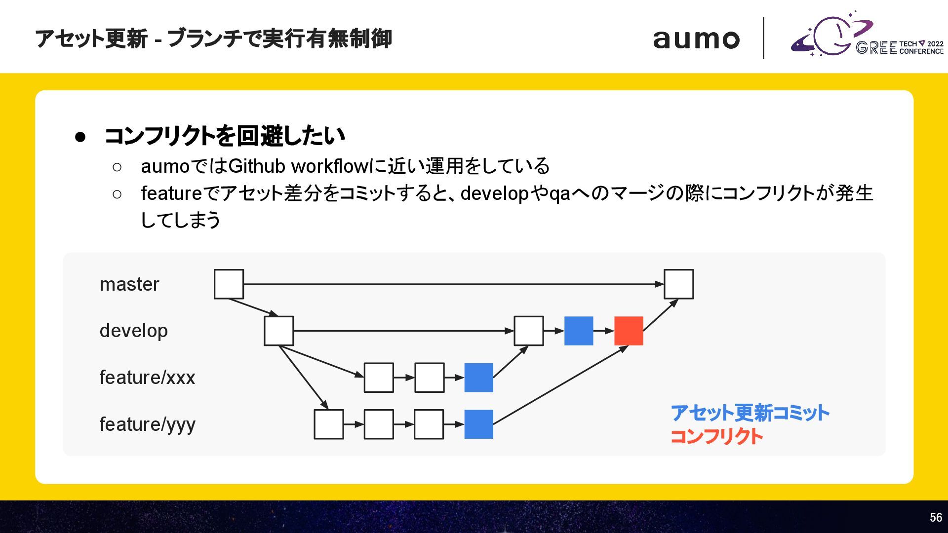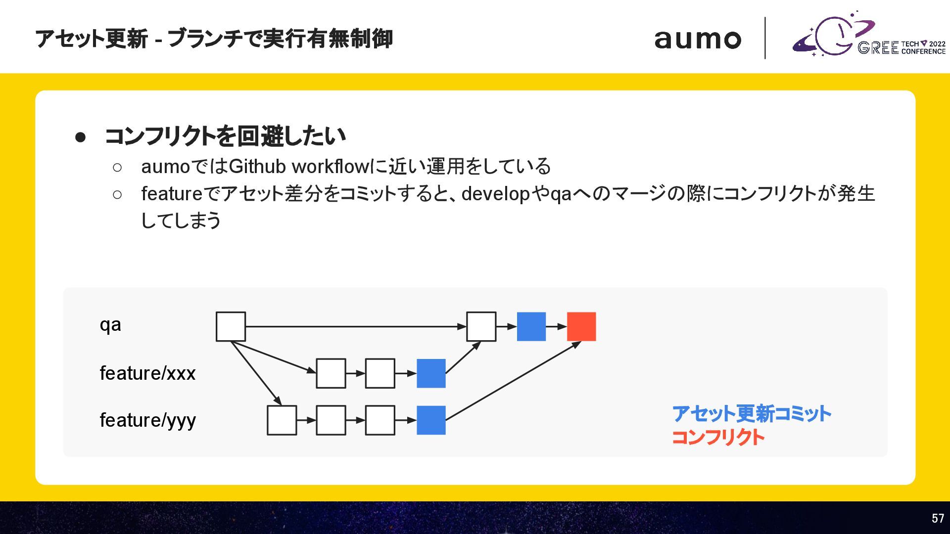 56 56 • コンフリクトを回避したい ◦ aumoではGithub workflowに近い運用をしている ◦ featureでアセット差分をコミットすると、developやqaへのマージの際にコンフリクトが発生 してしまう
