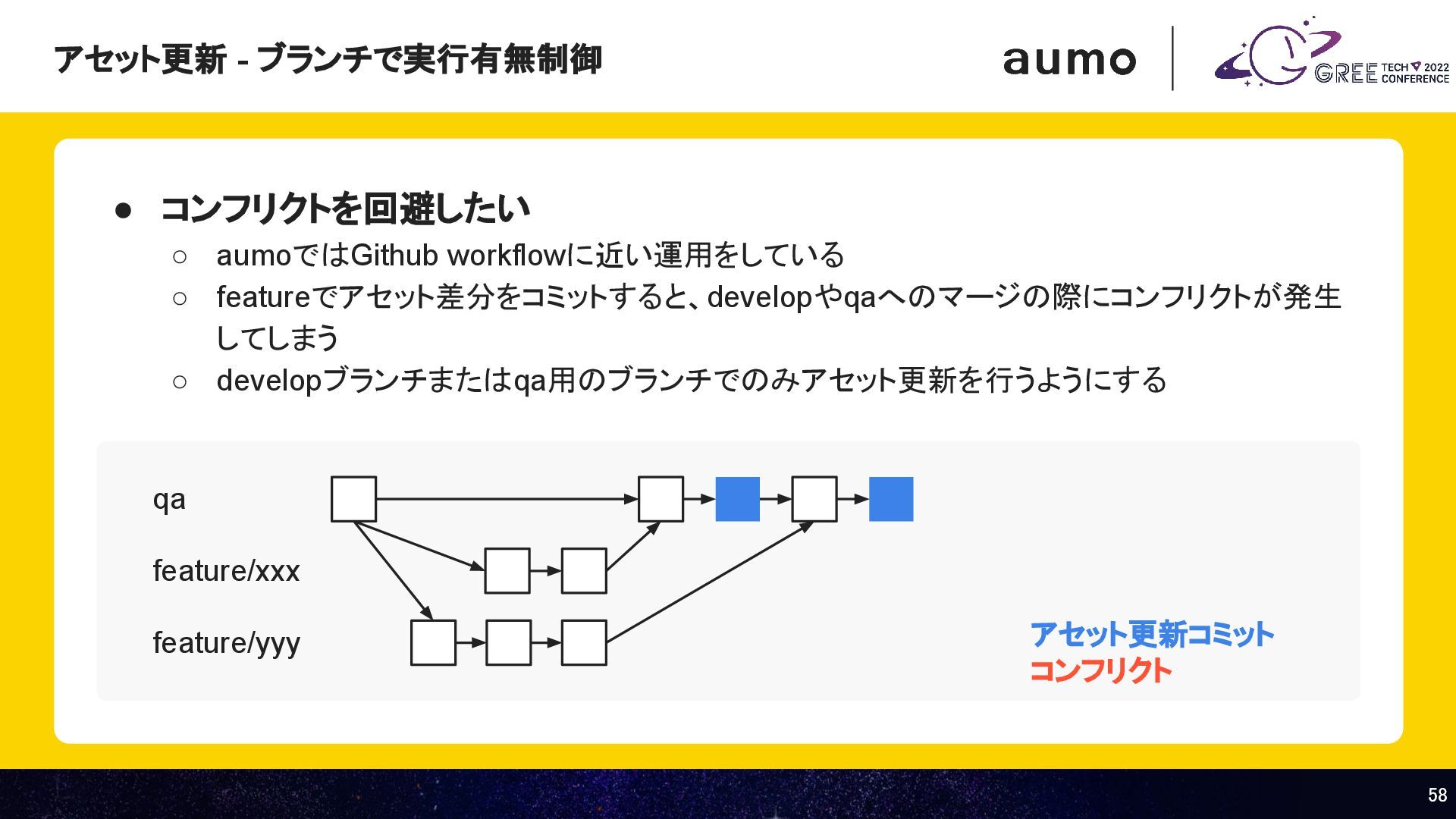 57 57 • コンフリクトを回避したい ◦ aumoではGithub workflowに近い運用をしている ◦ featureでアセット差分をコミットすると、developやqaへのマージの際にコンフリクトが発生 してしまう