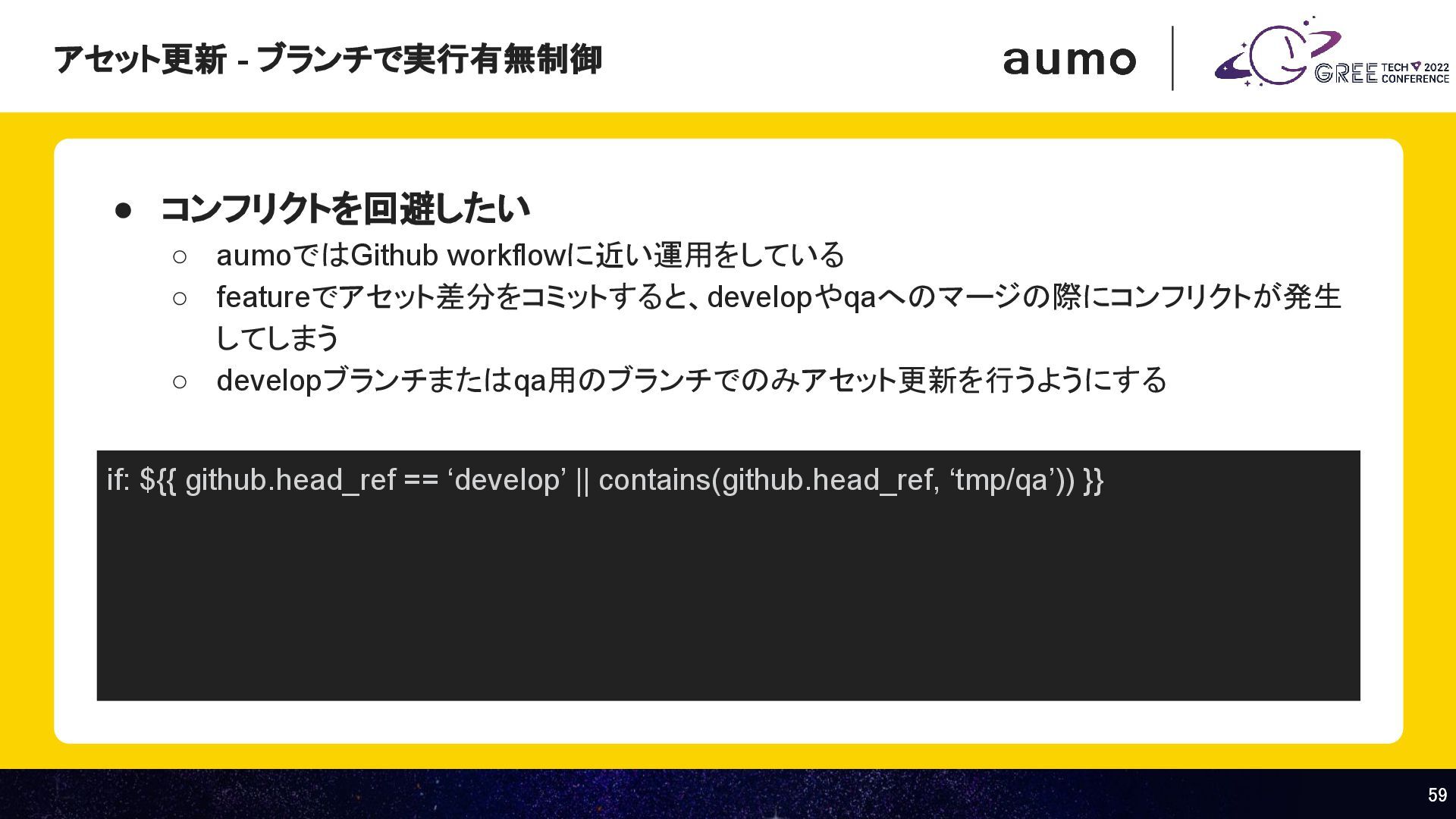 58 58 • コンフリクトを回避したい ◦ aumoではGithub workflowに近い運用をしている ◦ featureでアセット差分をコミットすると、developやqaへのマージの際にコンフリクトが発生 してしまう