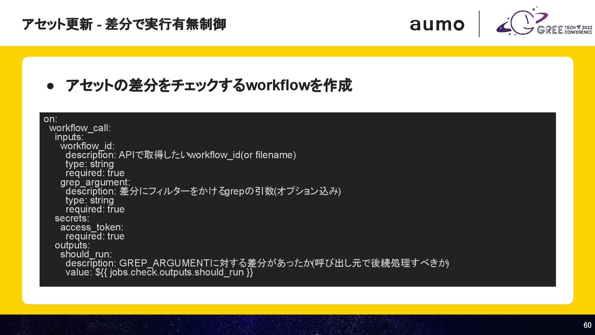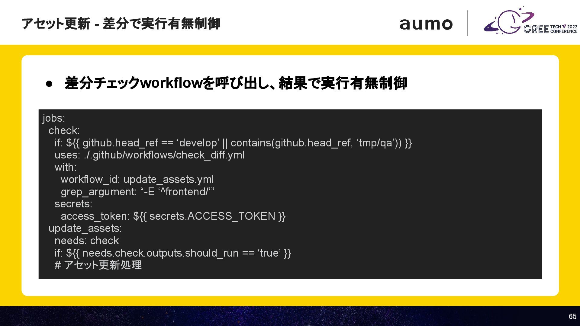 ‘develop’ || contains(github.head_ref, ‘tmp/qa’)) }} uses: ./.github/workflows/check_diff.yml with: workflow_id: update_assets.yml grep_argument: “-E ‘^frontend/’” secrets: access_token: ${{ secrets.ACCESS_TOKEN }} update_assets: needs: check if: ${{ needs.check.outputs.should_run == ‘true’ }} # アセット更新処理 アセット更新 - 差分で実行有無制御
