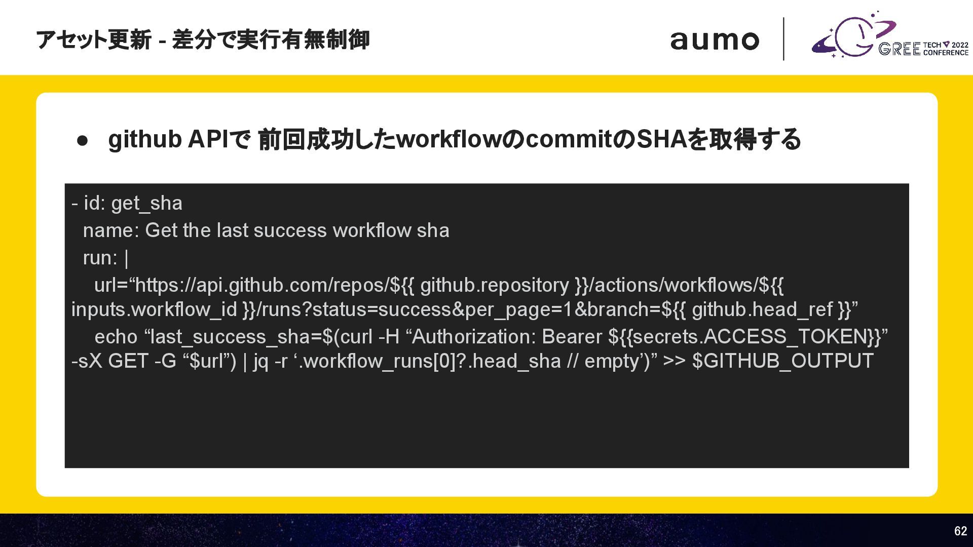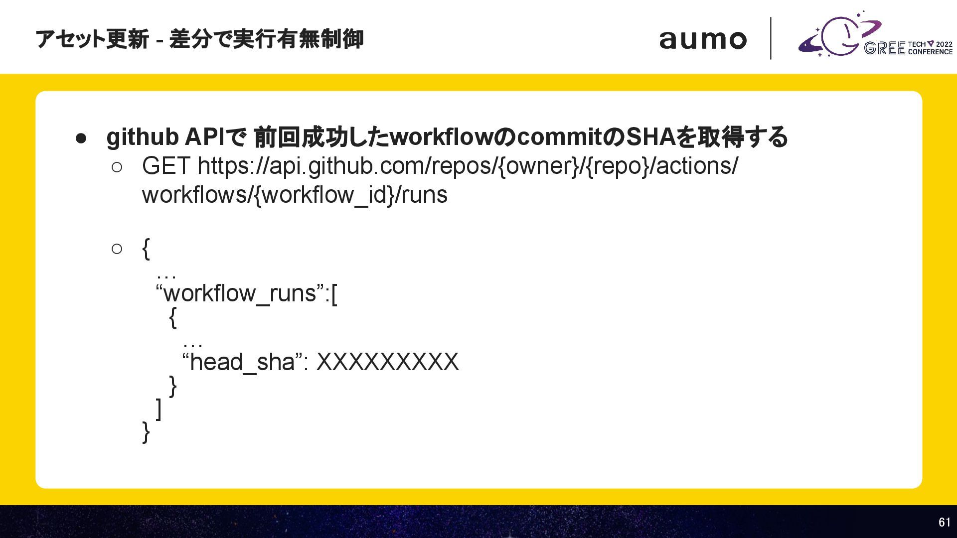 61 61 • github APIで 前回成功したworkflowのcommitのSHAを取得する ◦ GET https://api.github.com/repos/{owner}/{repo}/actions/ workflows/{workflow_id}/runs
