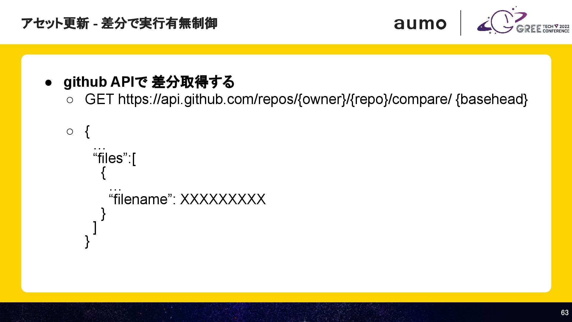 ◦ { … “files”:[ { … “filename”: XXXXXXXXX } ] } アセット更新 - 差分で実行有無制御
