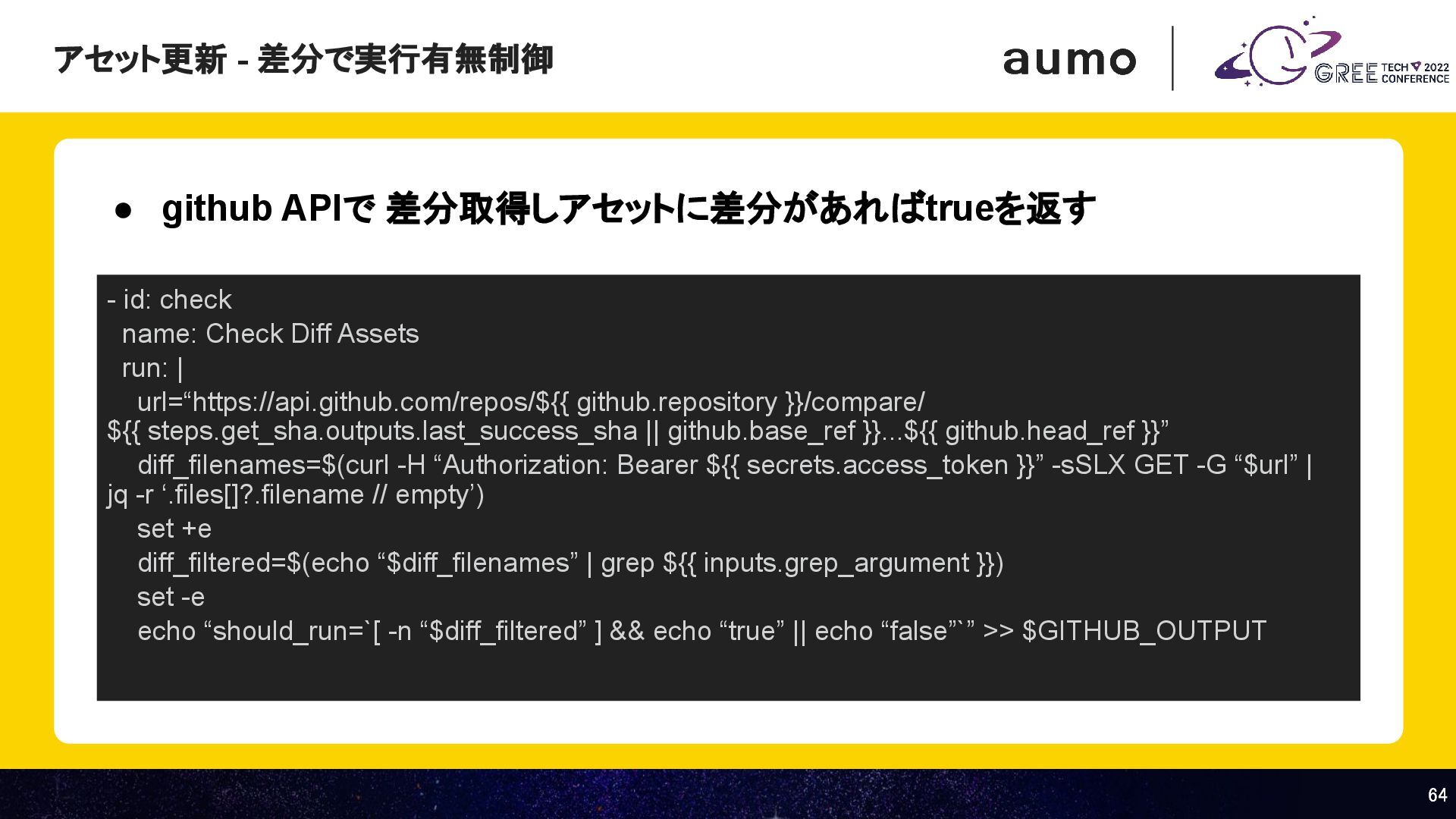 Check Diff Assets run: | url=“https://api.github.com/repos/${{ github.repository }}/compare/ ${{ steps.get_sha.outputs.last_success_sha || github.base_ref }}...${{ github.head_ref }}” diff_filenames=$(curl -H “Authorization: Bearer ${{ secrets.access_token }}” -sSLX GET -G “$url” | jq -r ‘.files[]?.filename // empty’) set +e diff_filtered=$(echo “$diff_filenames” | grep ${{ inputs.grep_argument }}) set -e echo “should_run=`[ -n “$diff_filtered” ] && echo “true” || echo “false”`” >> $GITHUB_OUTPUT アセット更新 - 差分で実行有無制御
