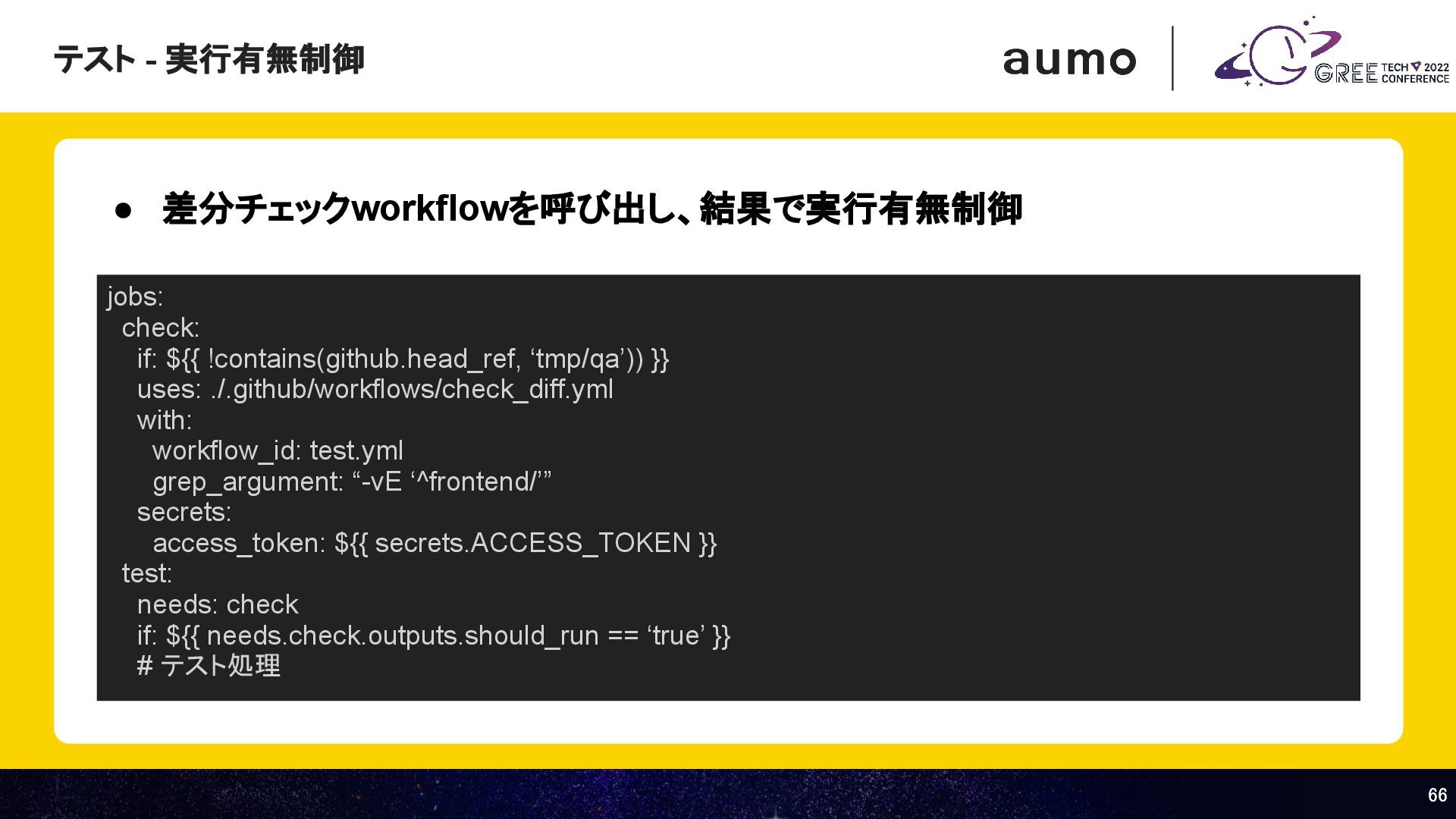 66 66 • 差分チェックworkflowを呼び出し、結果で実行有無制御 jobs: check: if: ${{ !contains(github.head_ref, ‘tmp/qa’))