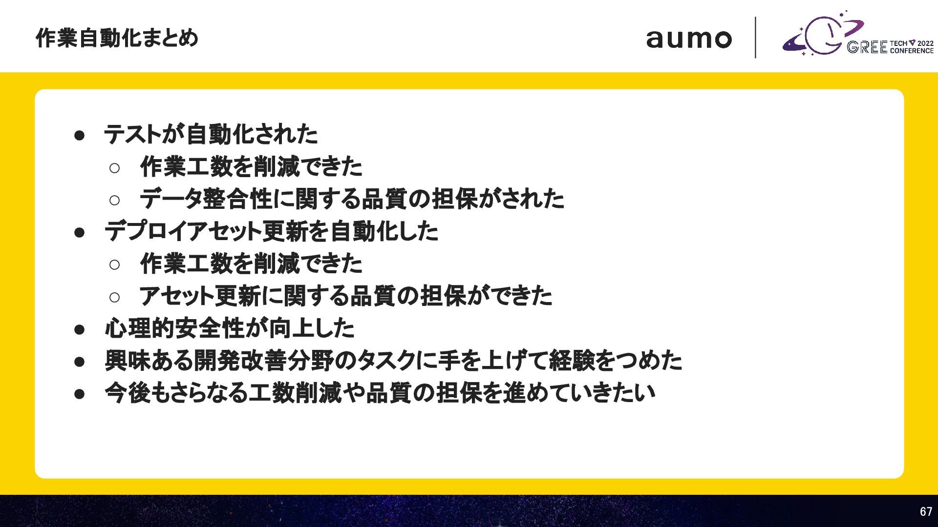 67 67 • テストが自動化された ◦ 作業工数を削減できた ◦ データ整合性に関する品質の担保がされた • デプロイアセット更新を自動化した