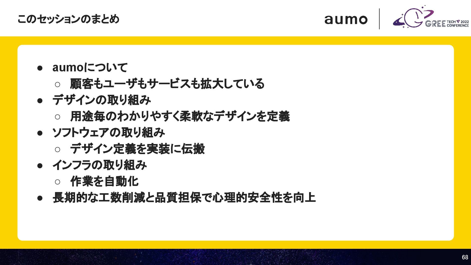 68 68 このセッションのまとめ • aumoについて ◦ 顧客もユーザもサービスも拡大している • デザインの取り組み ◦