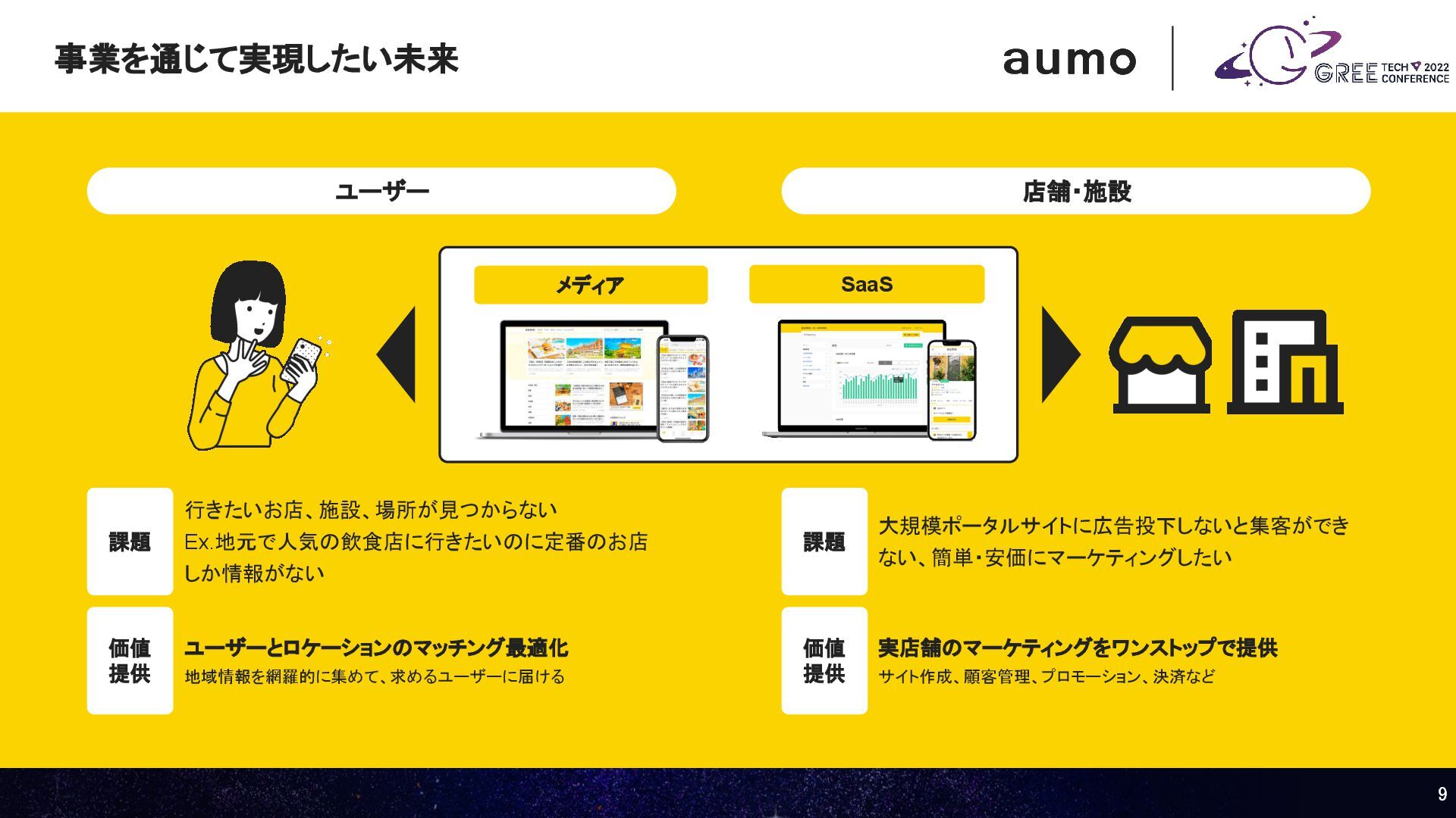 9 9 事業を通じて実現したい未来 メディア SaaS 課題 ユーザー 店舗・施設 行きたいお店、施設、場所が見つからない Ex.地元で人気の飲食店に行きたいのに定番のお店