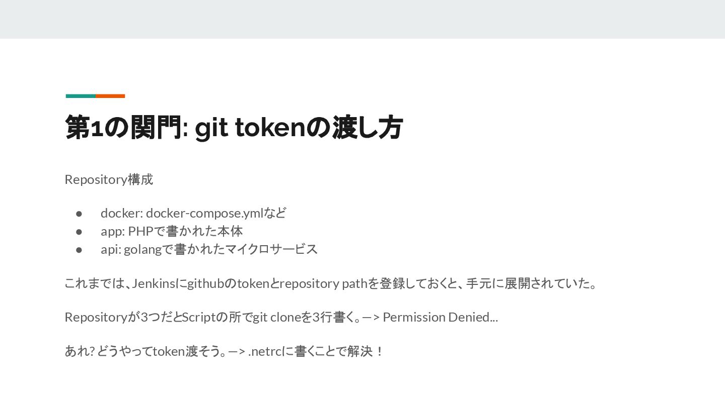 • api: golangで書かれたマイクロサービス これまでは、Jenkinsにgithubのtokenとrepository pathを登録しておくと、手元に展開されていた。 Repositoryが3つだとScriptの所でgit cloneを3行書く。—> Permission Denied... あれ? どうやってtoken渡そう。—> .netrcに書くことで解決!