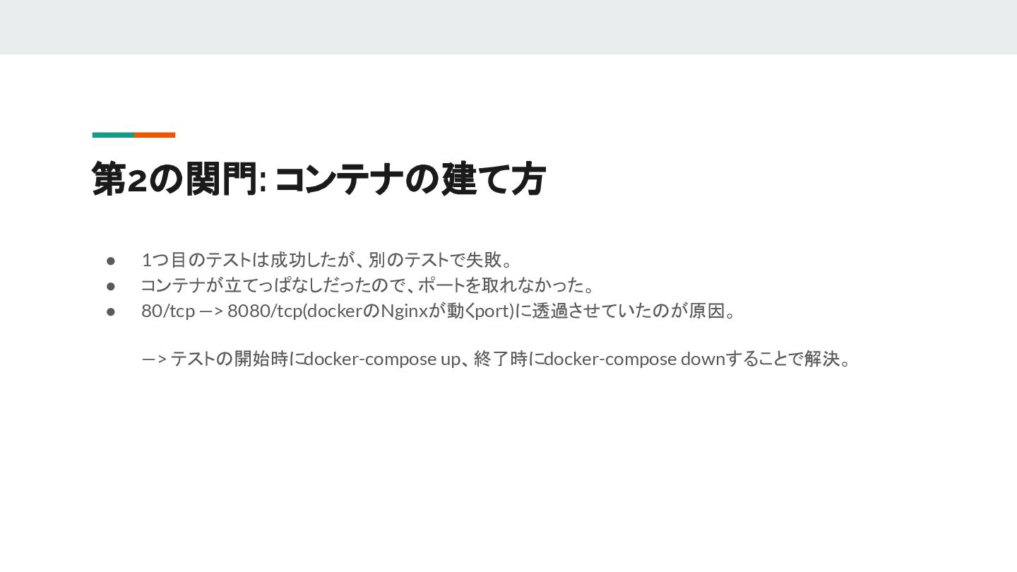 第2の関門: コンテナの建て方 • 1つ目のテストは成功したが、別のテストで失敗。 • コンテナが立てっぱなしだったので、ポートを取れなかった。 • 80/tcp —> 8080/tcp(dockerのNginxが動くport)に透過させていたのが原因。