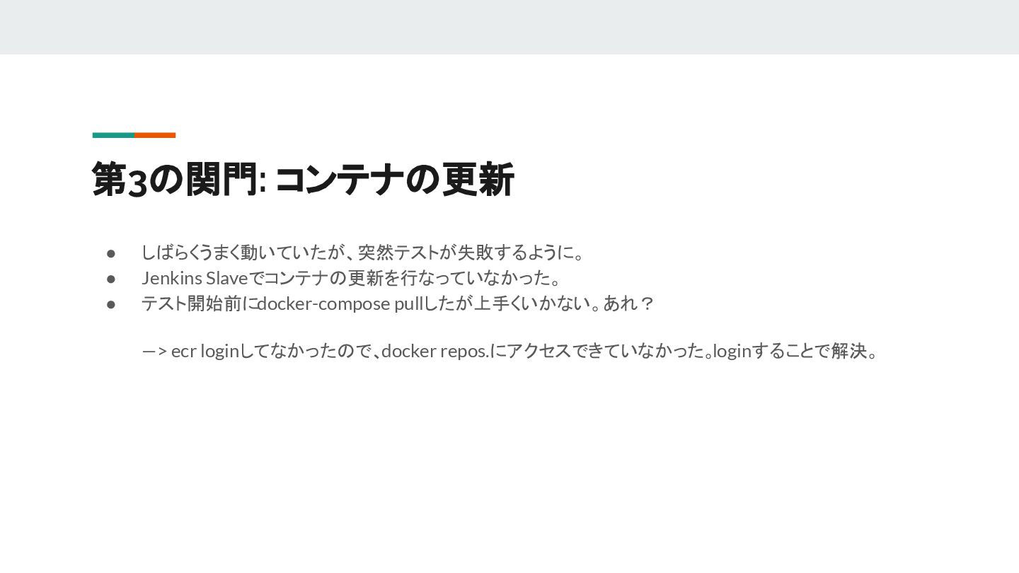 第3の関門: コンテナの更新 • しばらくうまく動いていたが、突然テストが失敗するように。 • Jenkins Slaveでコンテナの更新を行なっていなかった。 • テスト開始前にdocker-compose pullしたが上手くいかない。あれ?
