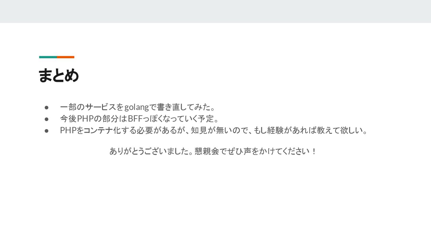 まとめ • 一部のサービスをgolangで書き直してみた。 • 今後PHPの部分はBFFっぽくなっていく予定。 • PHPをコンテナ化する必要があるが、知見が無いので、もし経験があれば教えて欲しい。 ありがとうございました。懇親会でぜひ声をかけてください!