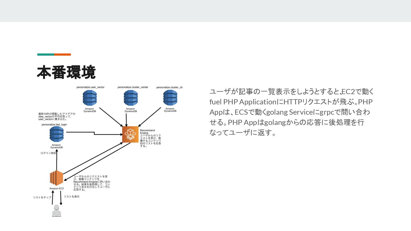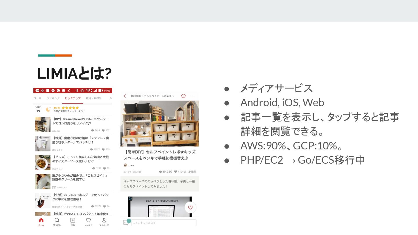 • AWS:90%、GCP:10%。 • PHP/EC2 → Go/ECS移行中