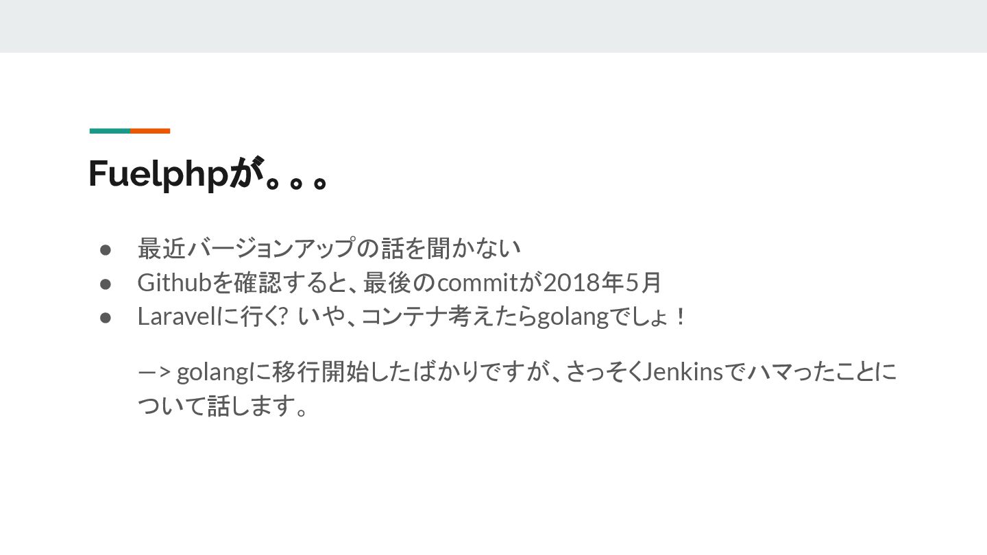 Fuelphpが。。。 • 最近バージョンアップの話を聞かない • Githubを確認すると、最後のcommitが2018年5月 • Laravelに行く? いや、コンテナ考えたらgolangでしょ! —> golangに移行開始したばかりですが、さっそくJenkinsでハマったことに