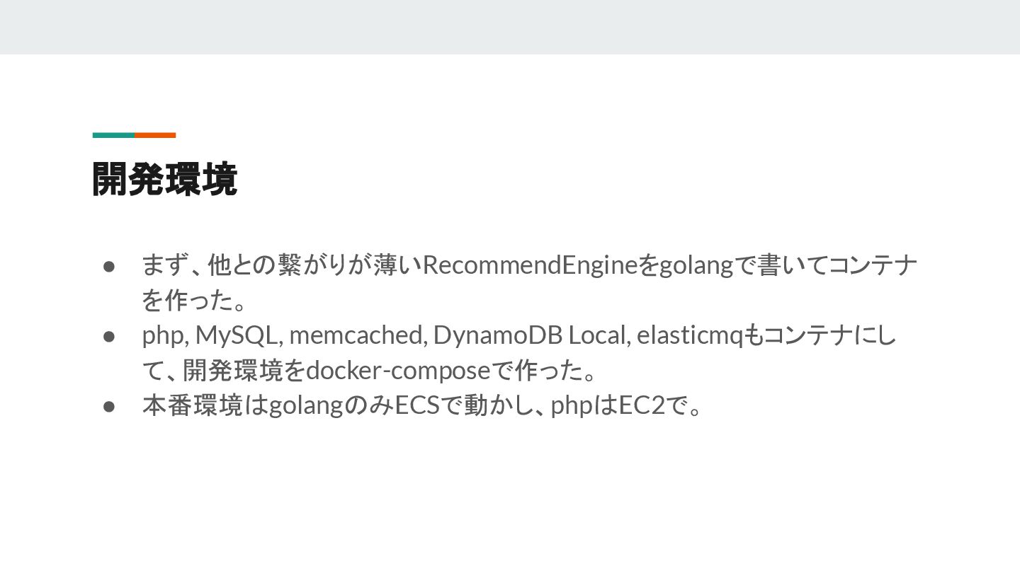 開発環境 • まず、他との繋がりが薄いRecommendEngineをgolangで書いてコンテナ を作った。 • php, MySQL, memcached, DynamoDB Local,