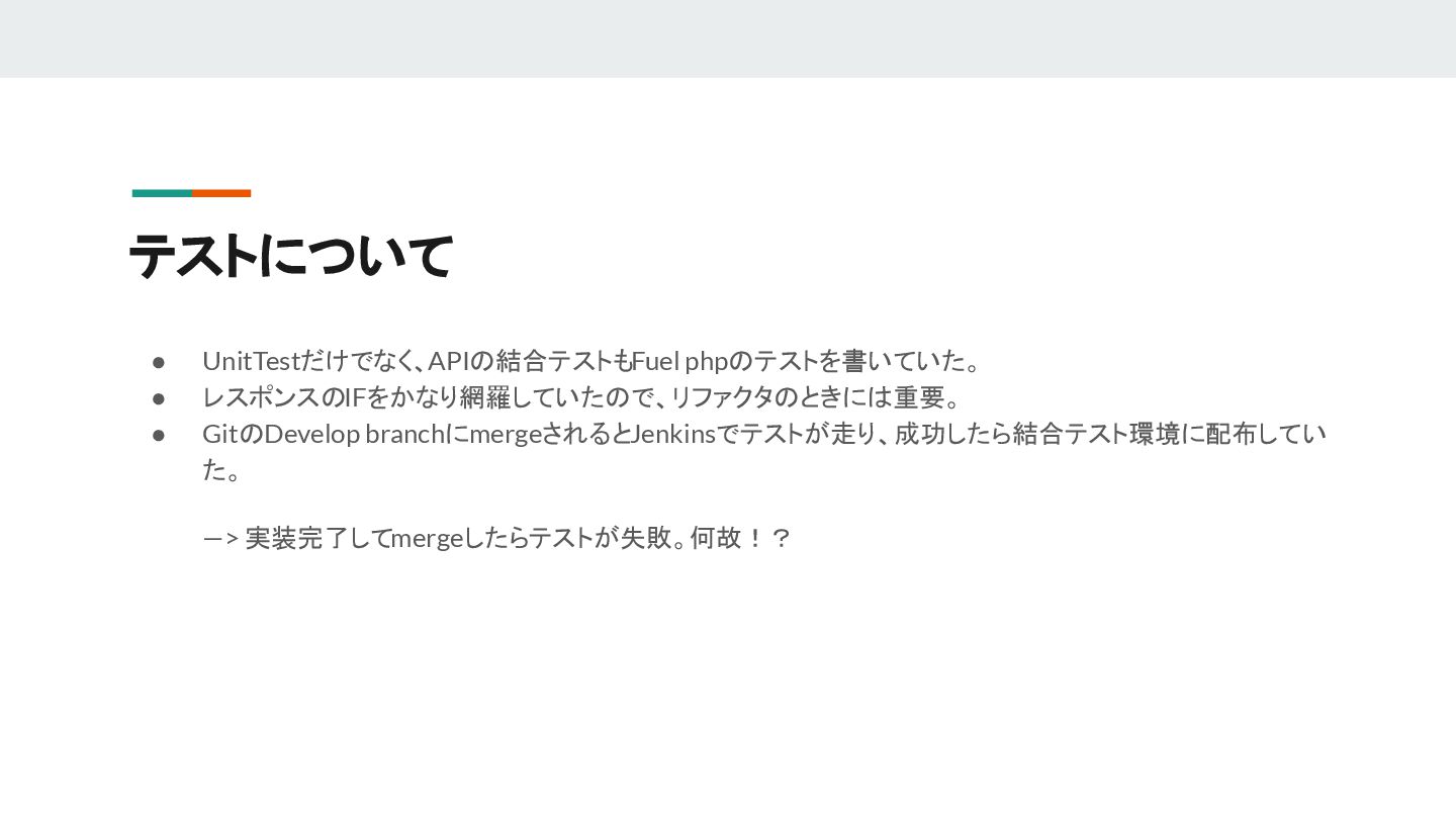 テストについて • UnitTestだけでなく、APIの結合テストもFuel phpのテストを書いていた。 • レスポンスのIFをかなり網羅していたので、リファクタのときには重要。 • GitのDevelop branchにmergeされるとJenkinsでテストが走り、成功したら結合テスト環境に配布してい た。