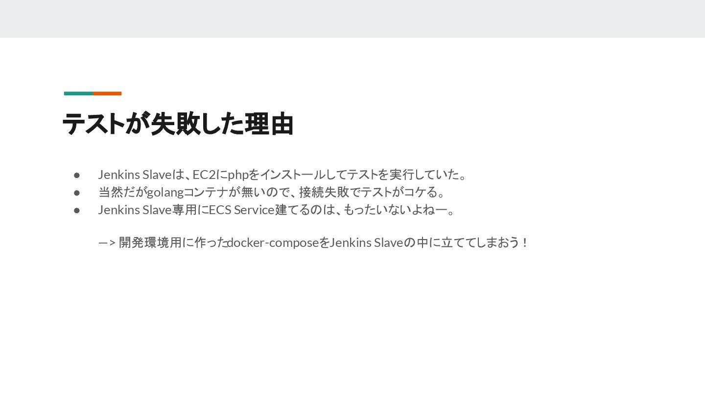 テストが失敗した理由 • Jenkins Slaveは、EC2にphpをインストールしてテストを実行していた。 • 当然だがgolangコンテナが無いので、接続失敗でテストがコケる。 • Jenkins Slave専用にECS Service建てるのは、もったいないよねー。