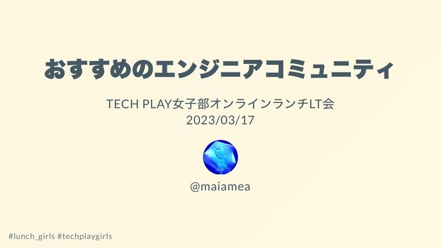 おすすめのエンジニアコミュニティ TECH PLAY 女子部オンラインランチLT 会 2023/03/17 @maiamea #lunch_girls #techplaygirls