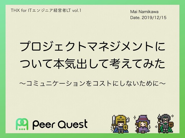 ϓϩδΣΫτϚωδϝϯτʹ ͍ͭͯຊؾग़ͯ͠ߟ͑ͯΈͨ ʙίϛϡχέʔγϣϯΛίετʹ͠ͳ͍ͨΊʹʙ 5)9GPS*5ΤϯδχΞܦӦऀ-5WPM .BJ/BNJLBXB %BUF