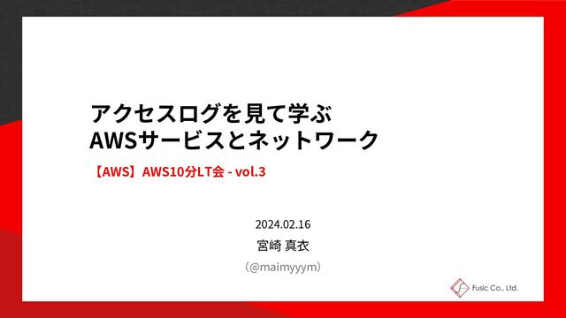 アクセスログを⾒て学ぶ AWSサービスとネットワーク 【AWS】AWS10分LT会 - vol.3 2024.02.16 宮崎 真⾐ (@maimyyym) 1
