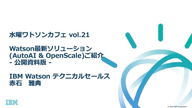 他社Cloud Power AI Intel ESS (Storage) ACC922 (Server) Watson ML Community Edition Watson ML Accelerator PowerAI Vision H2O Driverless AI Kubernetes Docker Watson Knowledge Catalog Watson ML Watson Studio Watson OpenScale Watson API Kubernetes Docker Watson Knowledge Catalog Watson ML Watson Studio Watson OpenScale Watson API Watson Knowledge Catalog Watson Machine Learning Watson Studio Watson OpenScale Watson API Cloud Foundry Storage / Database GPU ※ ※ Think2019でIBMは「Watson Anywhere」というコンセプトを提唱しました。 オープンを前提とした仮想化技術、クラウドサービス、ハードウェア製品、基礎研究などIBMの総合力を発揮して 「いつでもどこでも使えるAI」の提供を目指します。