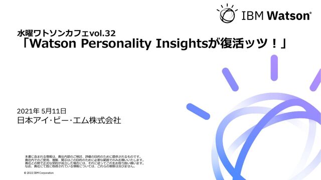 今すぐ使えるWatson API/サービス⼀覧 https://www.ibm.com/jp-ja/watson/products-services 知識探索 ⾳声 ⾔語 画像 照会応答 Text to Speech テキスト⽂章を⾳声に変換する Speech to Text ⾳声をテキスト⽂章に変換する Visual Recognition 画像コンテンツに含まれる意味を検出する Watson Assistant アプリケーションに⾃然⾔語インターフェースを追加してエンドユーザとのやり取りを⾃動化 Discovery 先進的な洞察エンジンを利⽤して、データの隠れた価値を解明し、回答 やトレンドを発⾒する Discovery News Discovery上に実装され、エンリッチ情報も付加されたニュースに関する 公開データセット Personality Insights テキストから筆者の性格を推定する Language Translator ⾃然⾔語テキストについて他⾔語へ翻訳を⾏う Natural Language Understanding テキストに意味付けを⾏う Natural Language Classifier テキスト⽂章の分類を⾏う Tone Analyzer (⽇本語未対応) テキストから筆者の感情を解析する Knowledge Studio コーディングなしに、業務知識から⽣成した機械学習モデルで、⾮ 構造テキストデータから洞察を取得