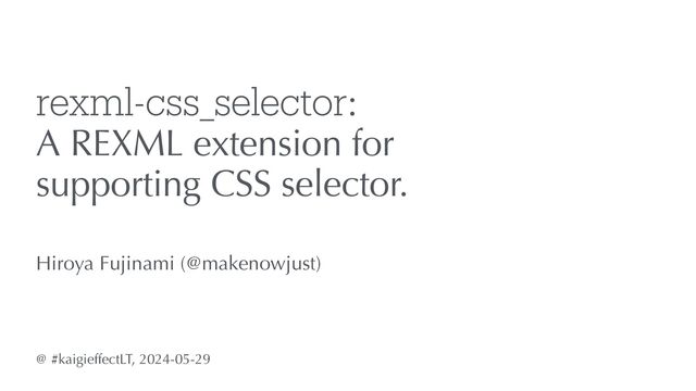 a v a lue is expected. ‣ This v a lue is repl a ced by substitutions[name] on run-time. REXML::CSSSelector.select_all( scope, 'div#main input[class=$user_value]', substitutions: { user_value: } ) A safe way to handle user values.