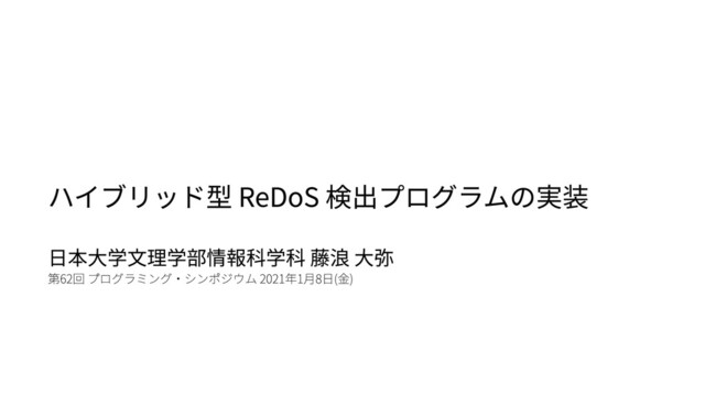 ReScue: Crafting regular ex-pression DoS attacks Proceedings of the 33rdACM/IEEE international conference on automated software engineering, ASE 2018, pp.225–235 (2018) [Weideman2016] Weideman, N., van der Merwe, B., Berglund,M. and Watson, B.: Analyzing matching timebehavior of backtracking regular expressionmatchers by using ambiguity of NFA Implementation and application of automata, pp.322–334 (2016) [高橋2020] 高橋和也,南出靖彦:正規表現マッチングの計算量解析ツールの拡張と高速化 第22回プログラミングおよびプログラミング言語ワークショップ(PPL) (2020)