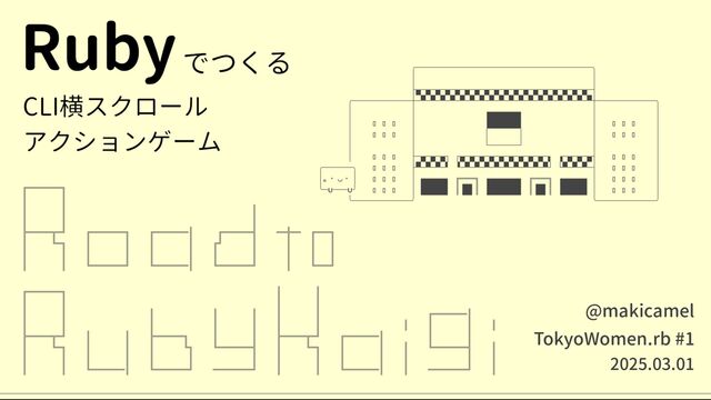。・◡・│ ╰─∪─∪╯ PLAYER <<~PLAYER, ╭────╮ │ 。・◡・│ ╰∪─∪─╯ PLAYER ] print "\e[2J" # 画面クリア 5.times do PLAYERS.each do |player| print "\e[1;1H" + player # 毎回1;1の位置に描画する sleep 0.5 end end