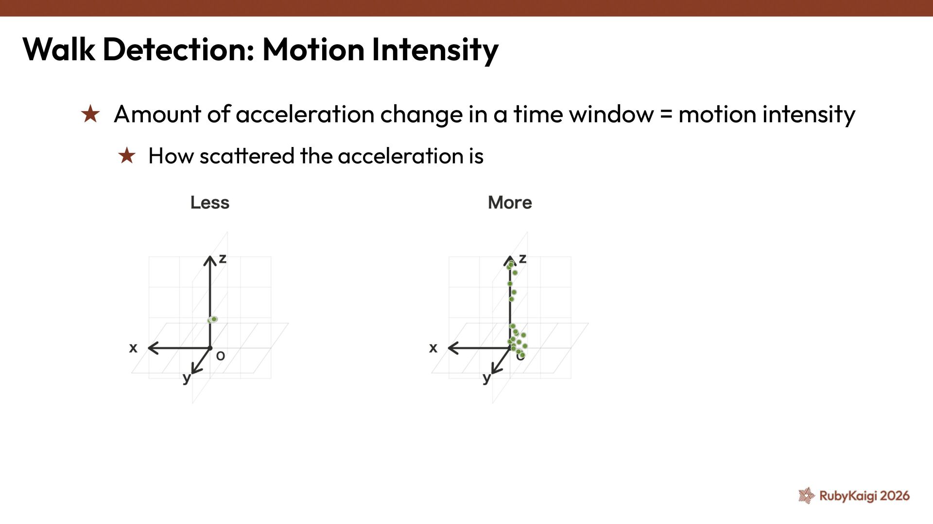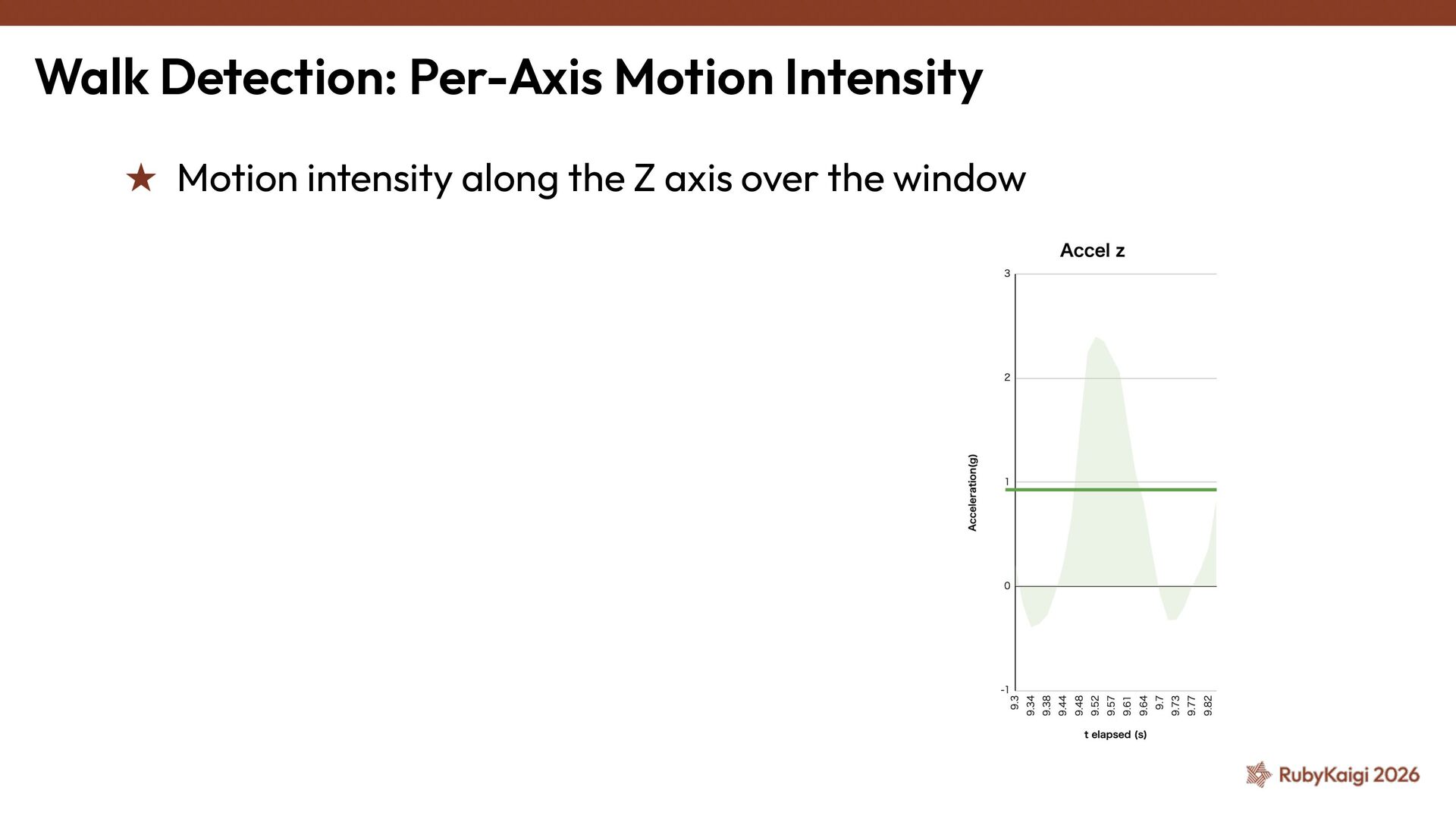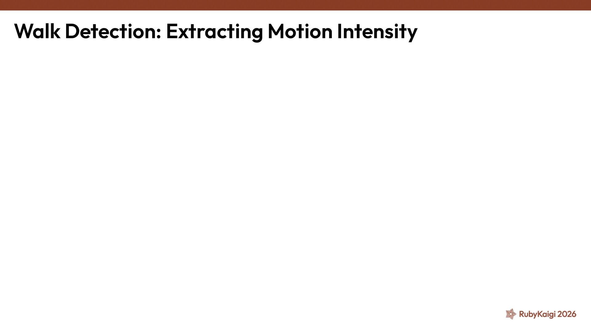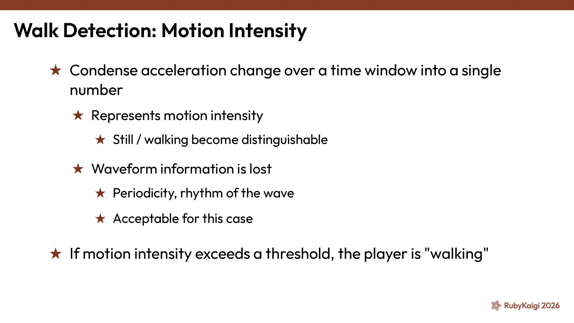 window into a single number Represents motion intensity Still / walking become distinguishable Waveform information is lost Periodicity, rhythm of the wave Acceptable for this case If motion intensity exceeds a threshold, the player is "walking"