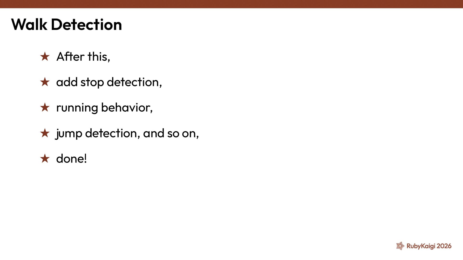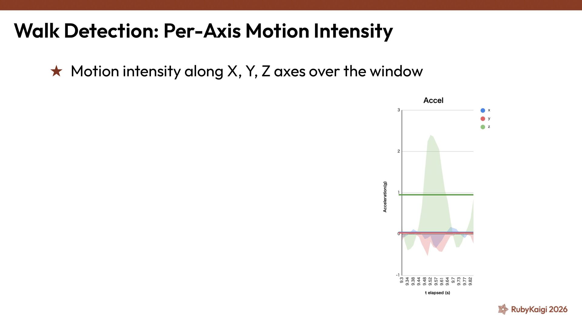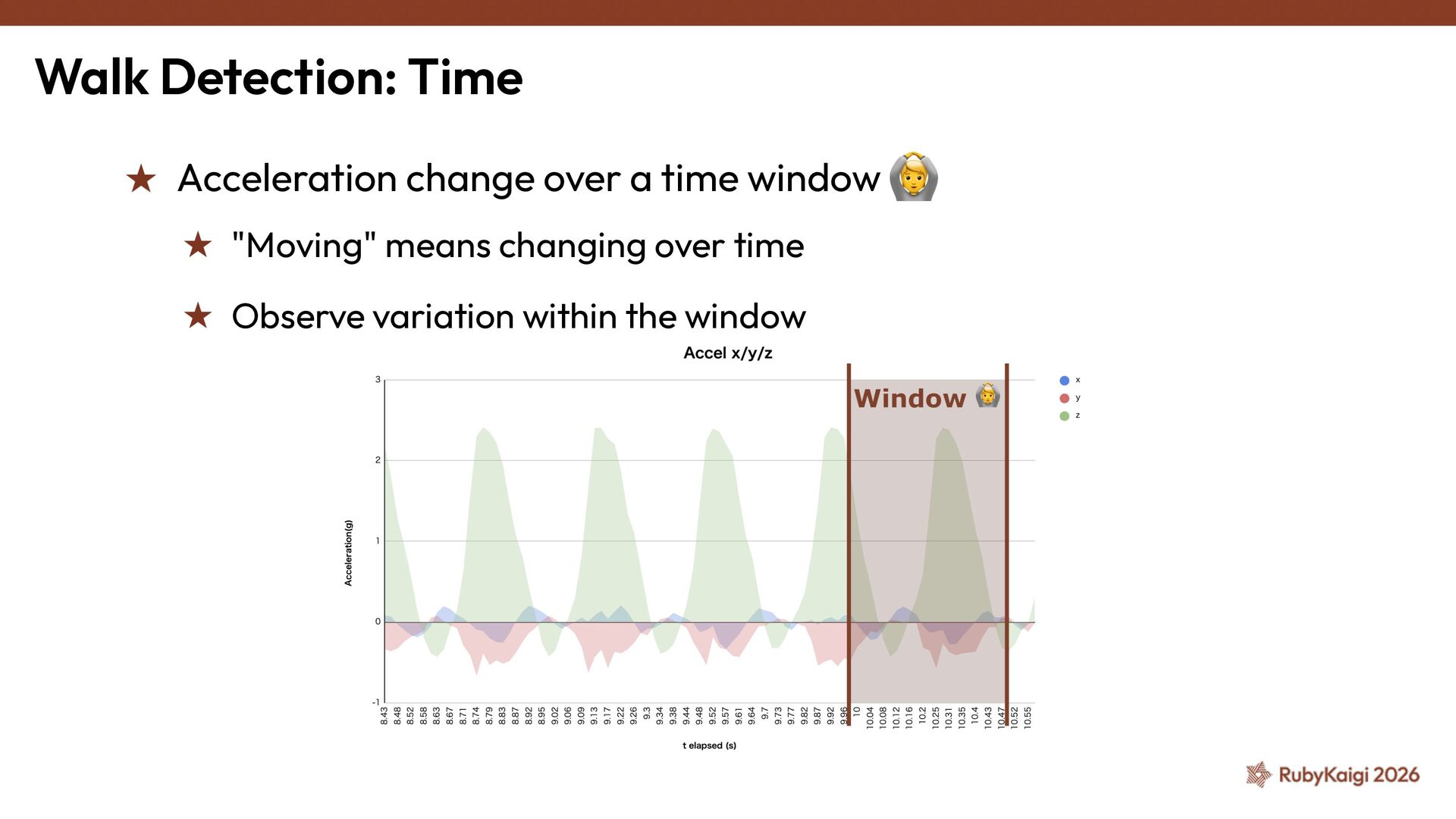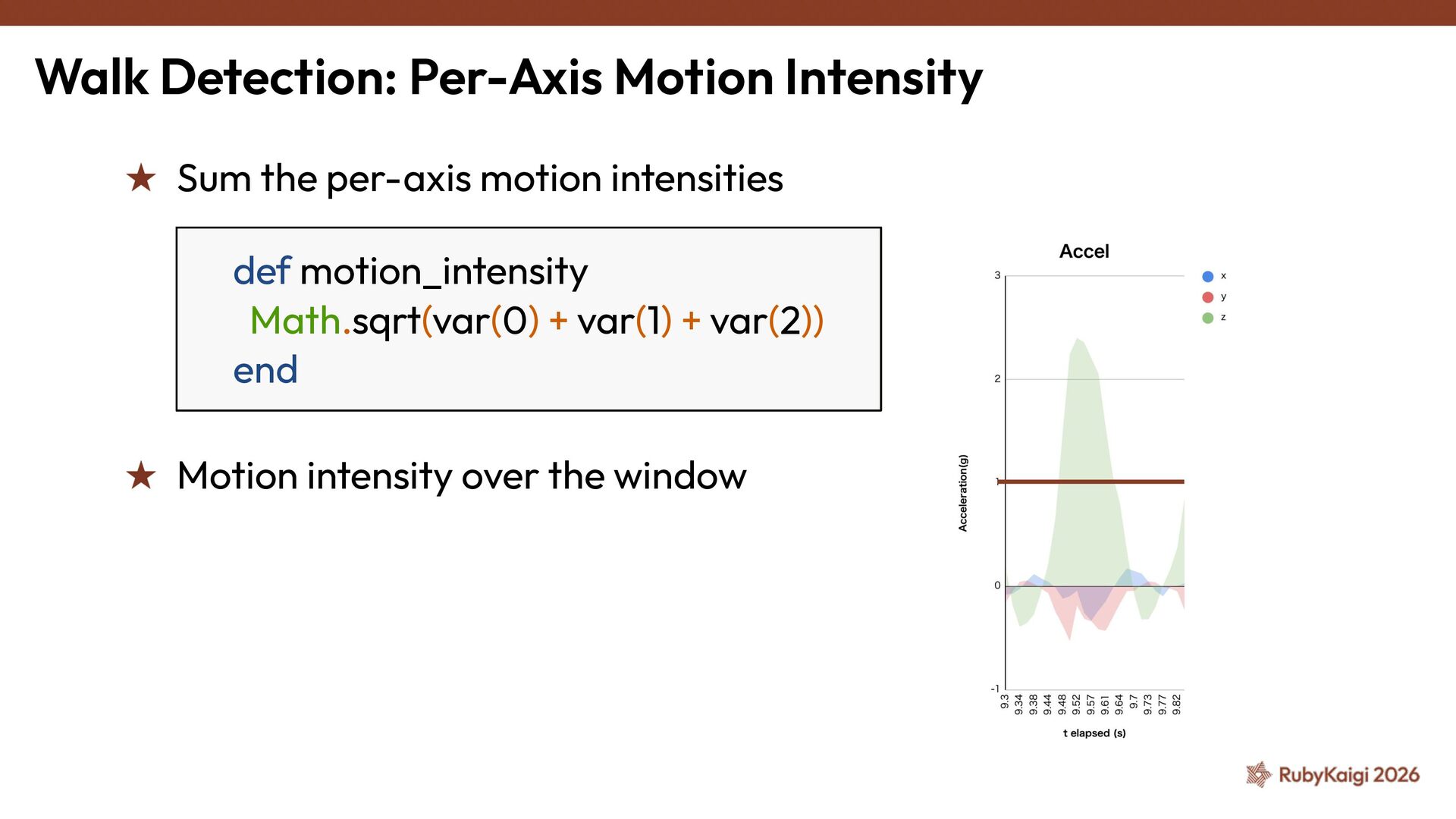 window into a single number Represents motion intensity Still / walking become distinguishable Waveform information is lost Periodicity, rhythm of the wave Acceptable for this case If motion intensity exceeds a threshold, the player is "walking"