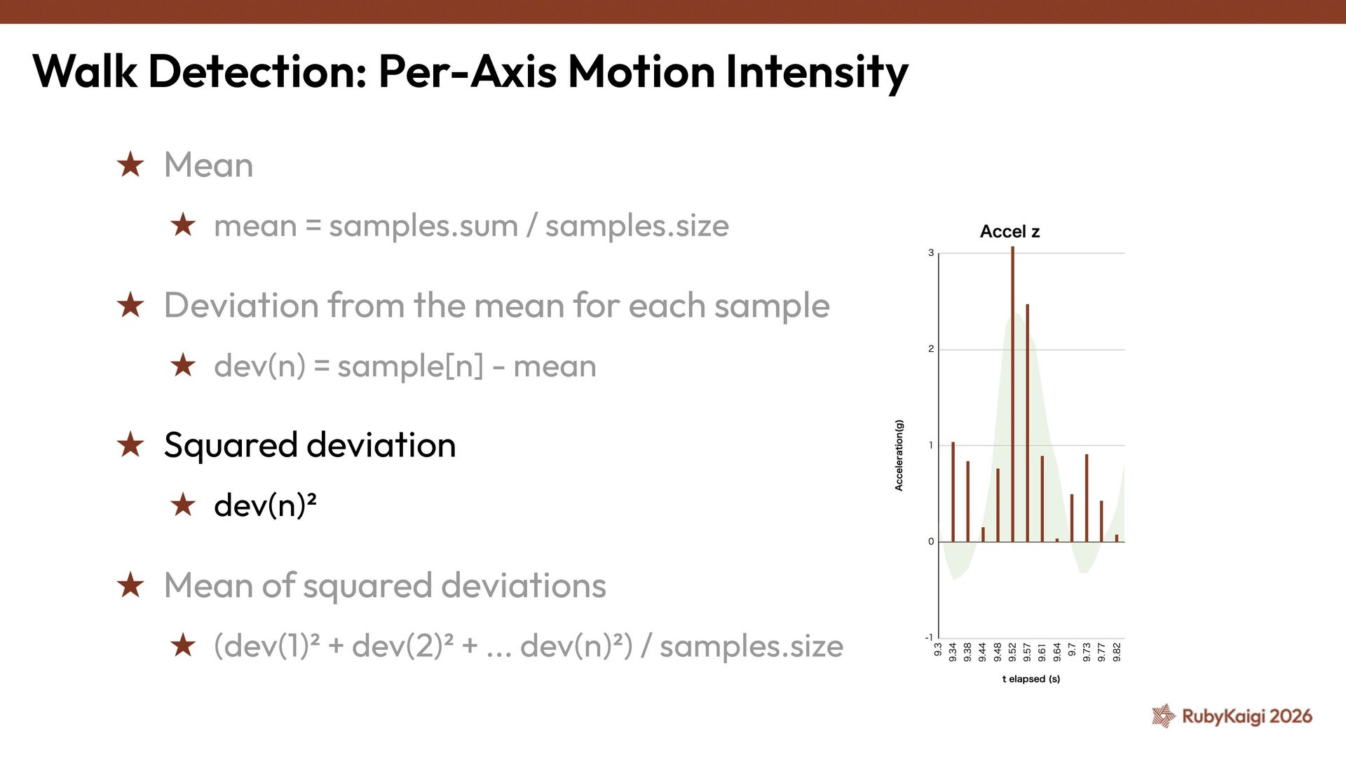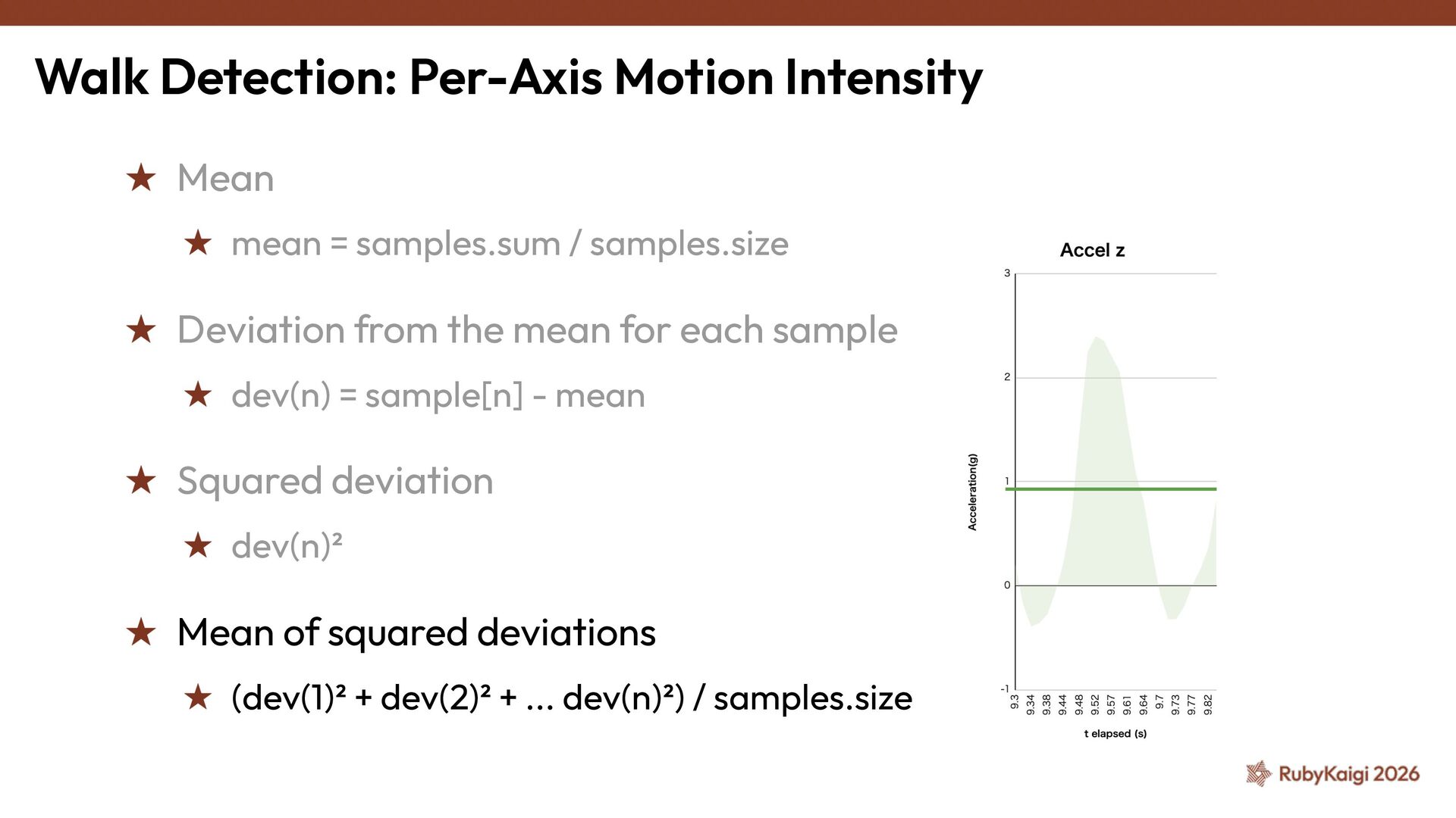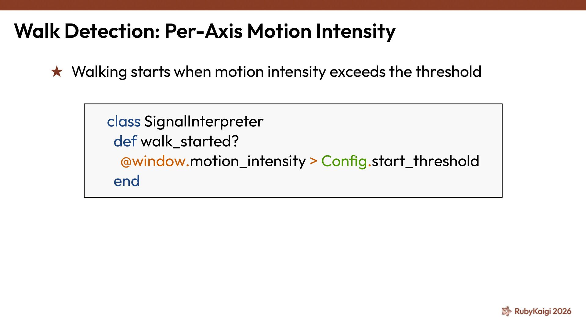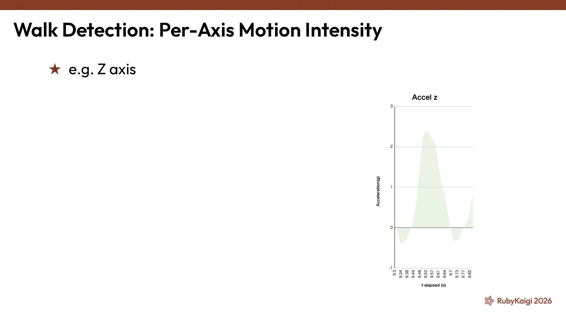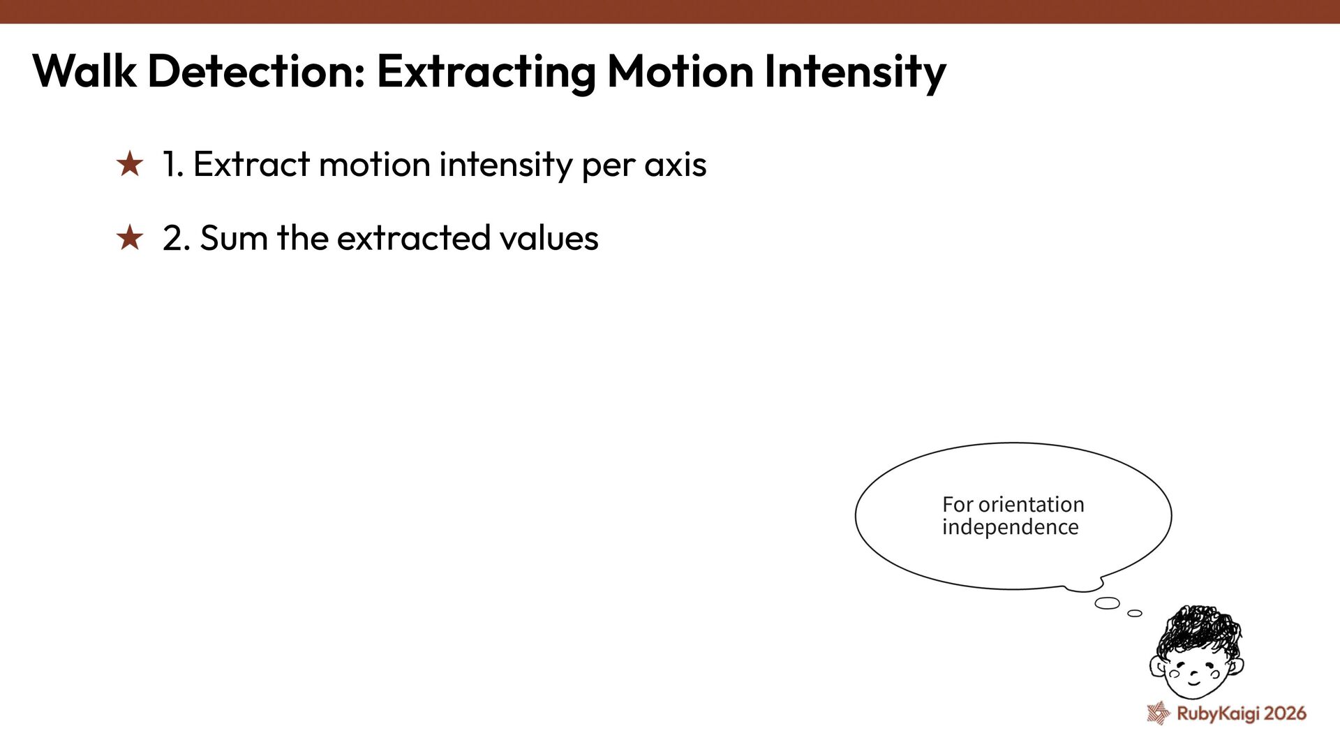 window into a single number Represents motion intensity Still / walking become distinguishable Waveform information is lost Periodicity, rhythm of the wave Acceptable for this case If motion intensity exceeds a threshold, the player is "walking"