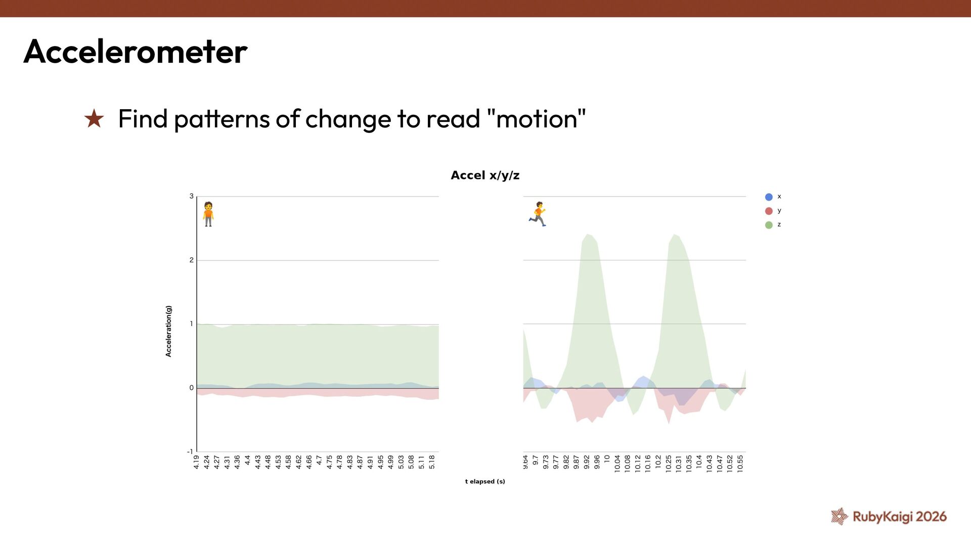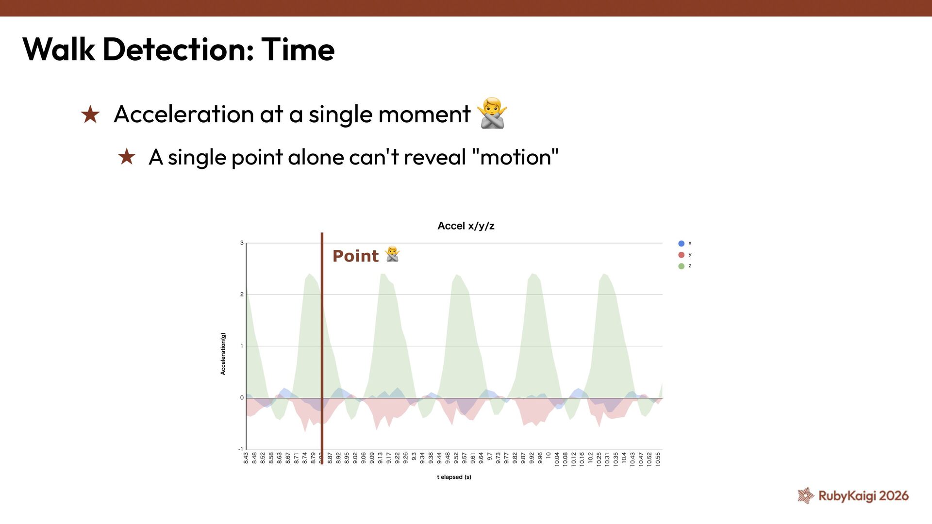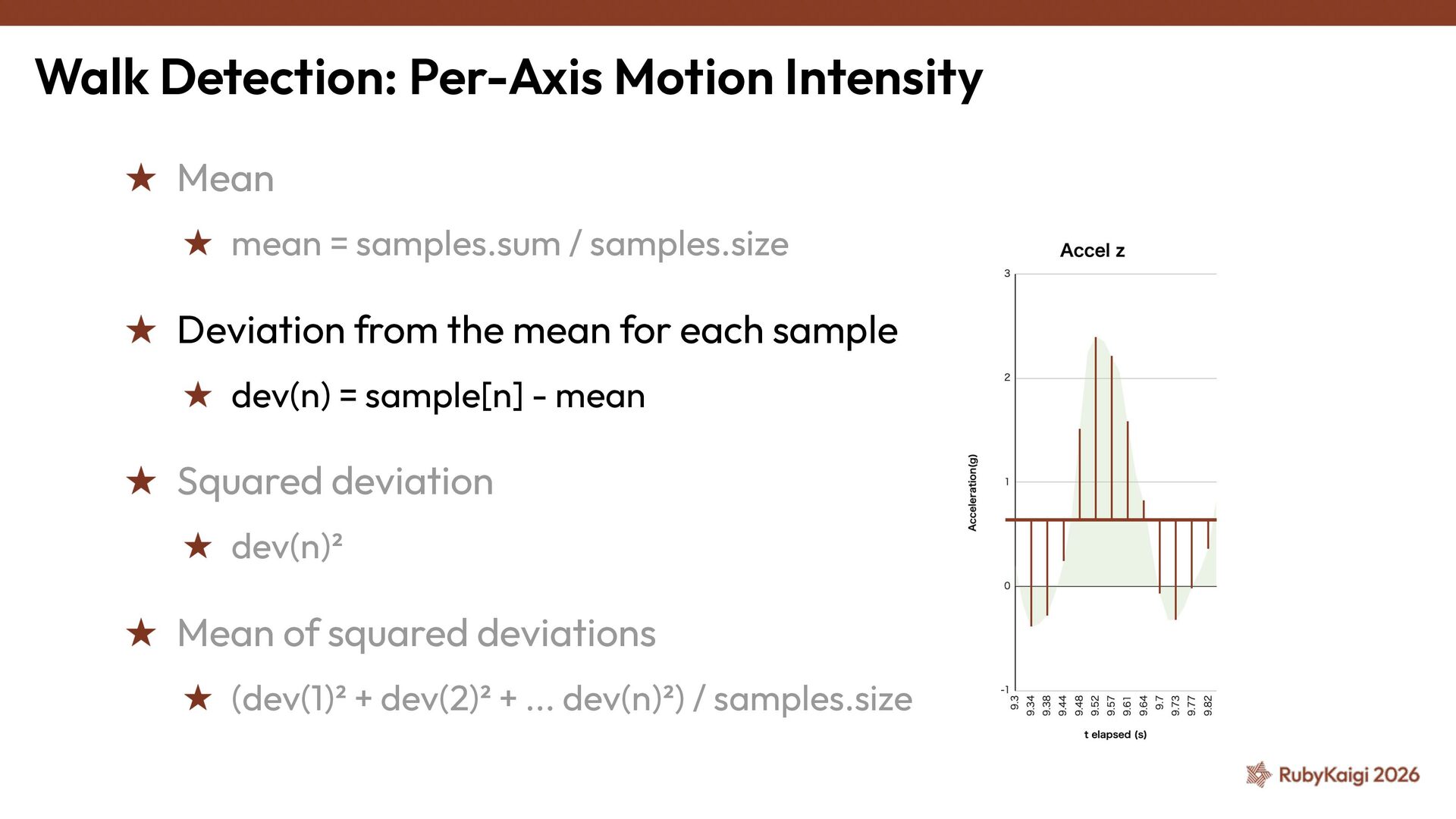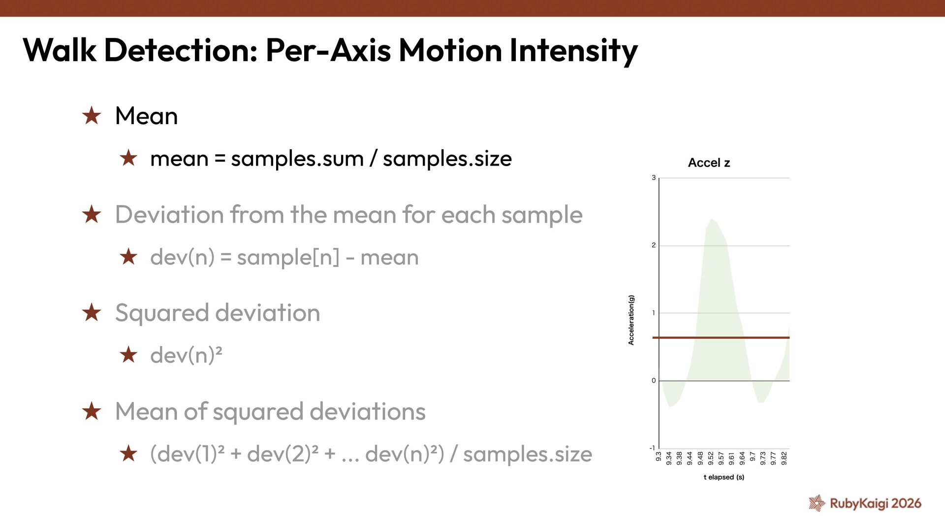 window into a single number Represents motion intensity Still / walking become distinguishable Waveform information is lost Periodicity, rhythm of the wave Acceptable for this case If motion intensity exceeds a threshold, the player is "walking"