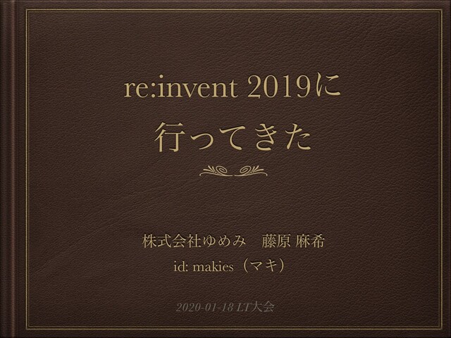 re:invent 2019ʹ ߦ͖ͬͯͨ גࣜձࣾΏΊΈɹ౻ݪ ຑر id: makiesʢϚΩʣ 2020-01-18 LTେձ