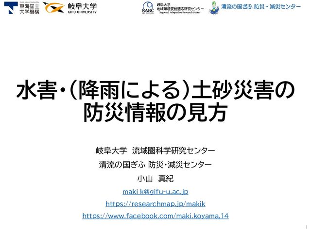清流の国ぎふ 防災・減災センター 水害・(降雨による)土砂災害の 防災情報の見方 岐阜大学 流域圏科学研究センター 清流の国ぎふ 防災・減災センター 小山 真紀