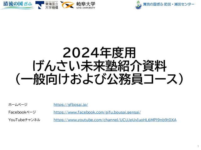 清流の国ぎふ 防災・減災センター 2024年度用 げんさい未来塾紹介資料 (一般向けおよび公務員コース) ホームページ https://gfbosai.jp/ Facebookページ https://www.facebook.com/gifu.bousai.gensai/ YouTubeチャンネル