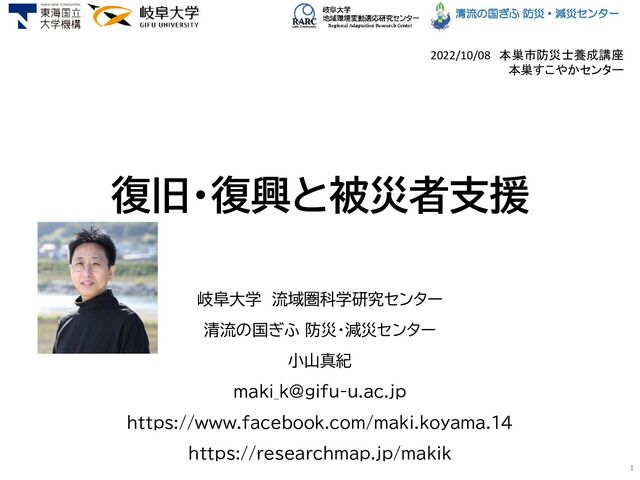 次回 • 日時:2022年10月10日(月・祝)14:00~ • 場所:下呂市きこりセンター(対面)・防災減災センターfacebookページ(オンライ ン) • https://www.facebook.com/gifu.bousai.gensai/ • 後日防災減災センターのYouTubeチャンネルでも配信予定です。 • 内容 • 「下呂市内土砂災害・水害」 当時の経験、今なお残る被災状況から学び次に活かせること • 下呂市副市長 田口 広宣
